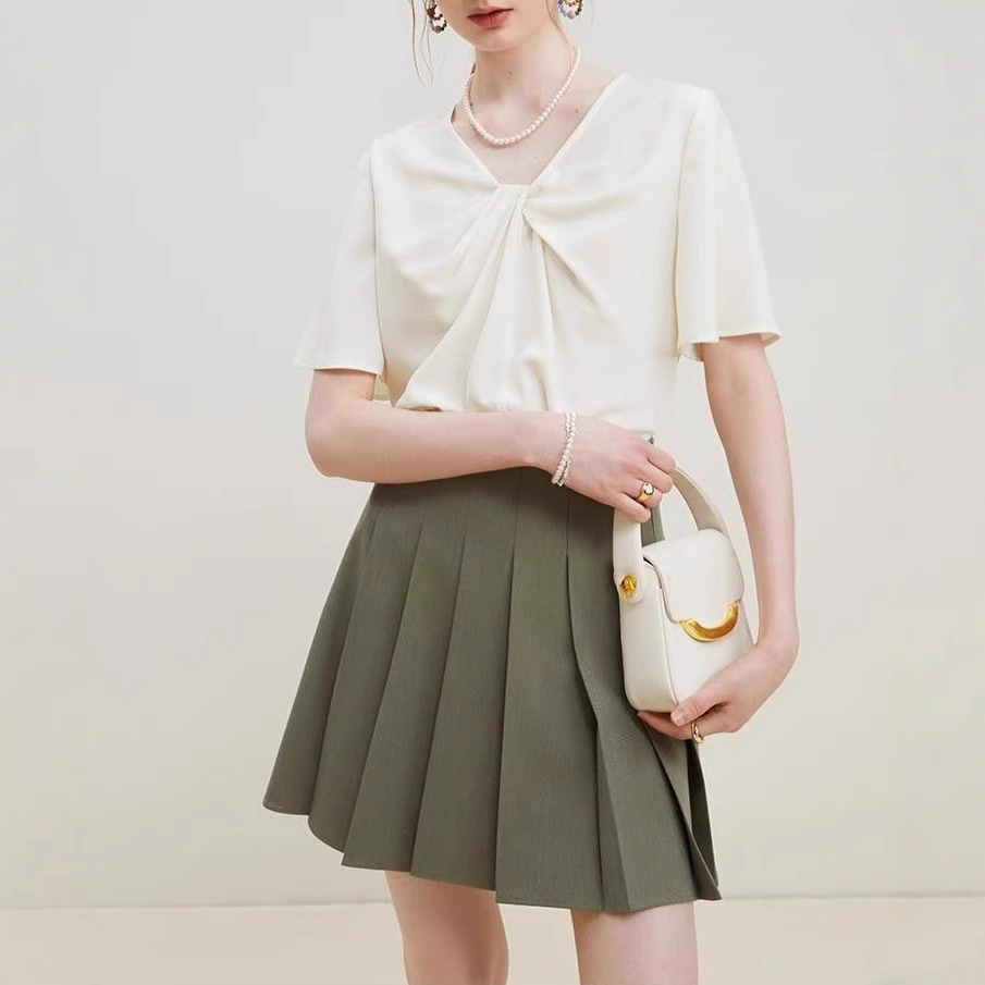 米色V领短袖衬衫女夏款设计感小众气质扭结雪纺上衣