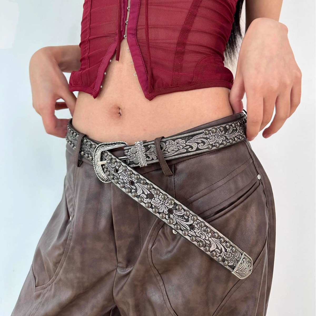 西部风复古做旧穿线铆钉压花皮带小众个性百搭y2k辣妹腰带