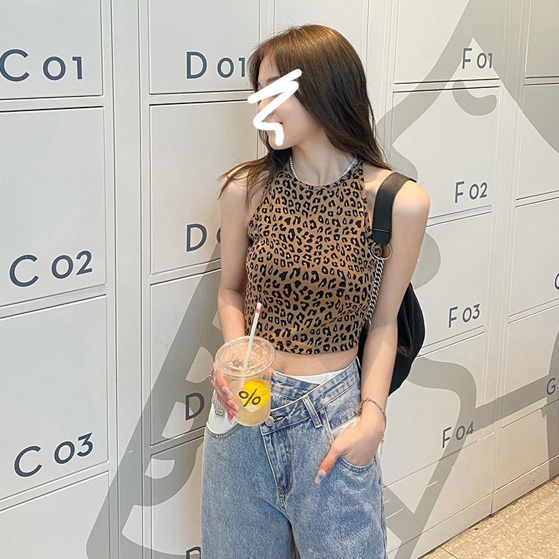 夏季辣妹豹纹吊带背心外穿修身小众露背绑带短款上衣