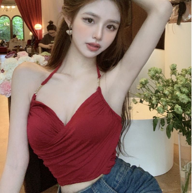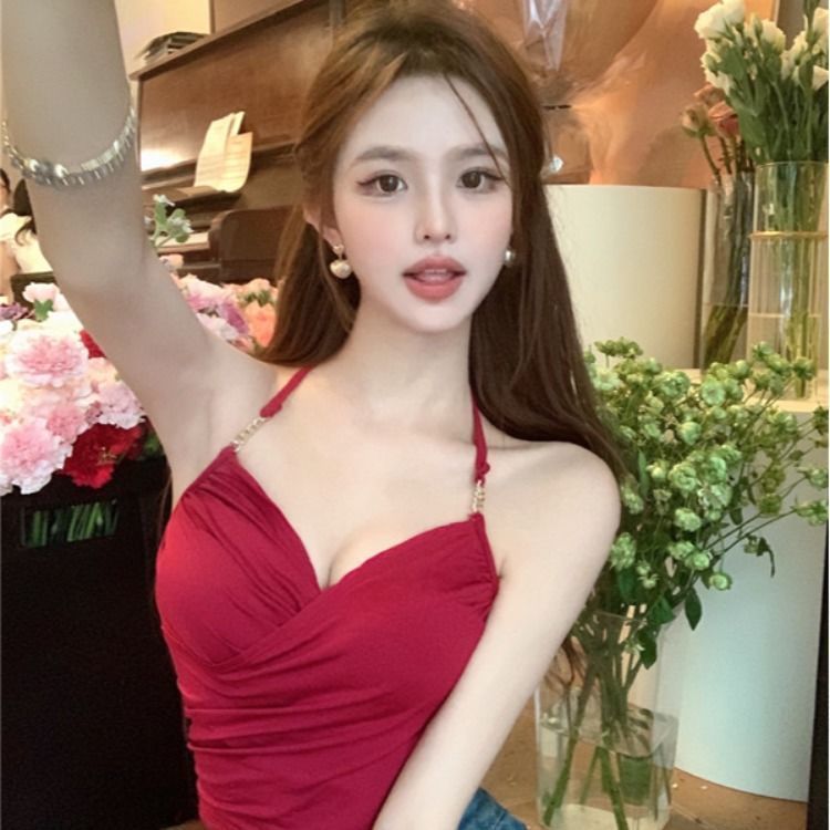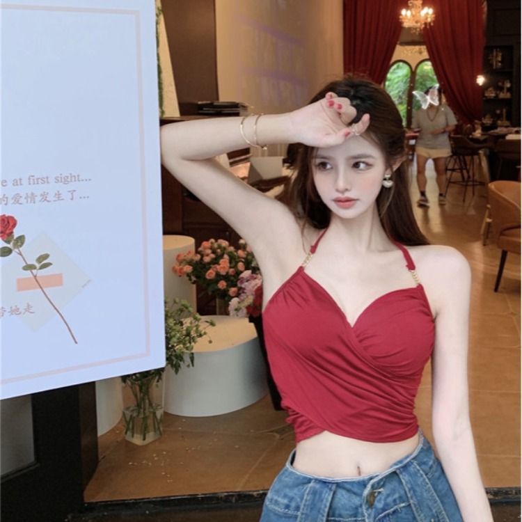 系带挂颈背心吊带夏季纯欲甜辣高腰露背短款上衣
