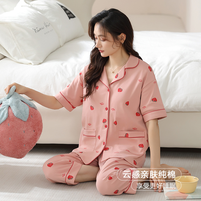 纯棉睡衣女夏季短袖七分裤甜美卡通开衫宽松大码家居服新款