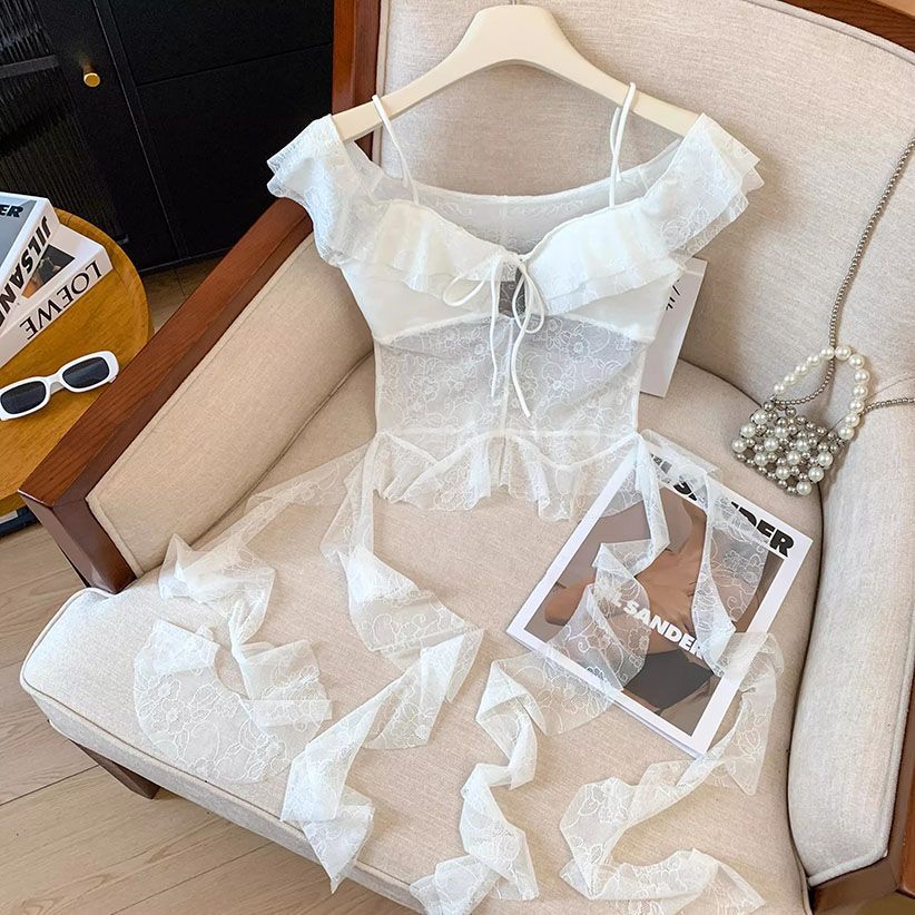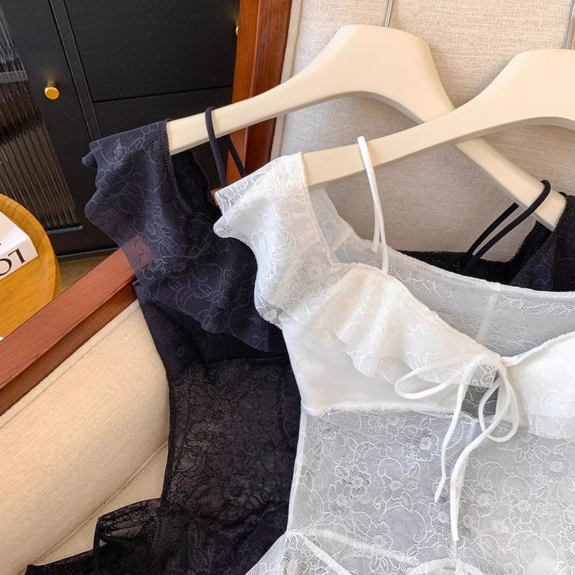 【月销10万】纯欲风一字肩蕾丝吊带背心飘带花边设计感修身显瘦上