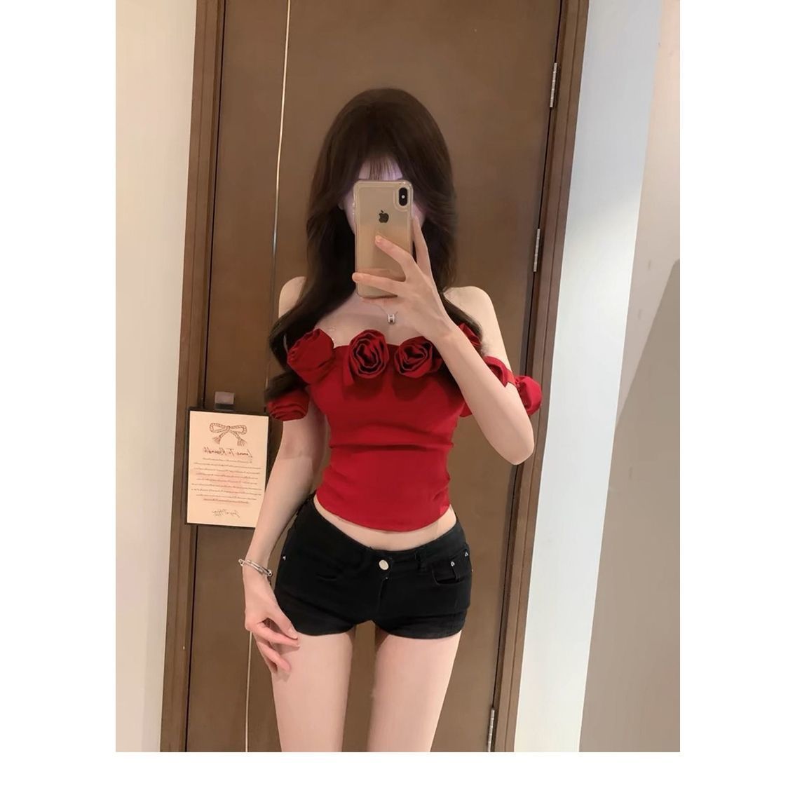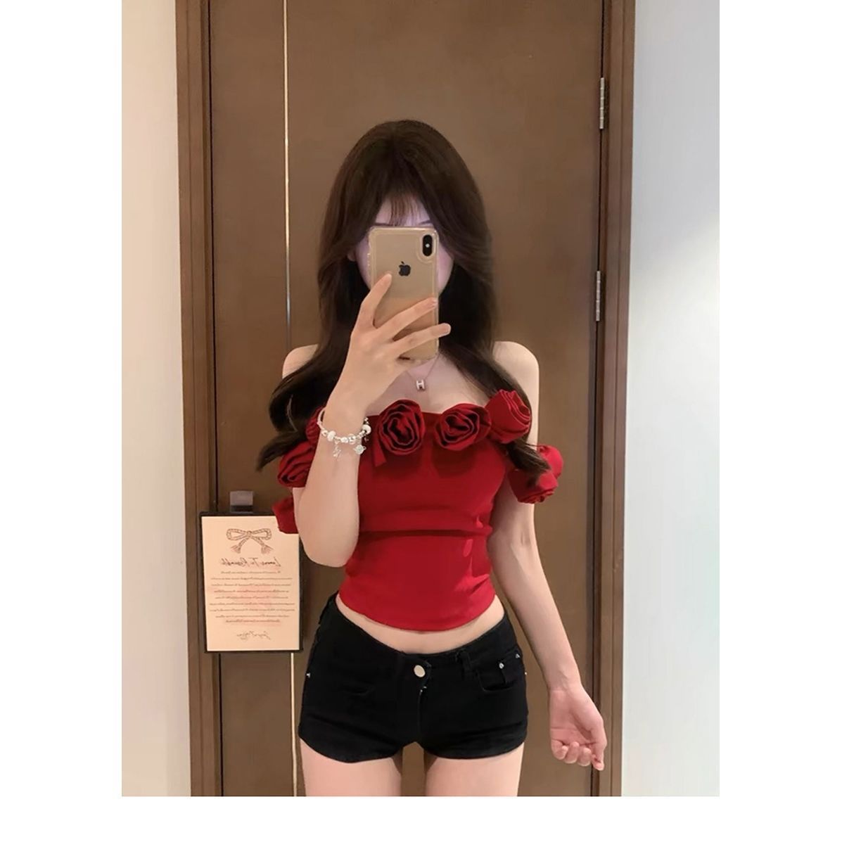 2025夏新款韩版微胖mm性感玫瑰一字肩辣妹T恤女法式纯欲收腰上衣