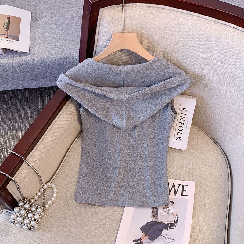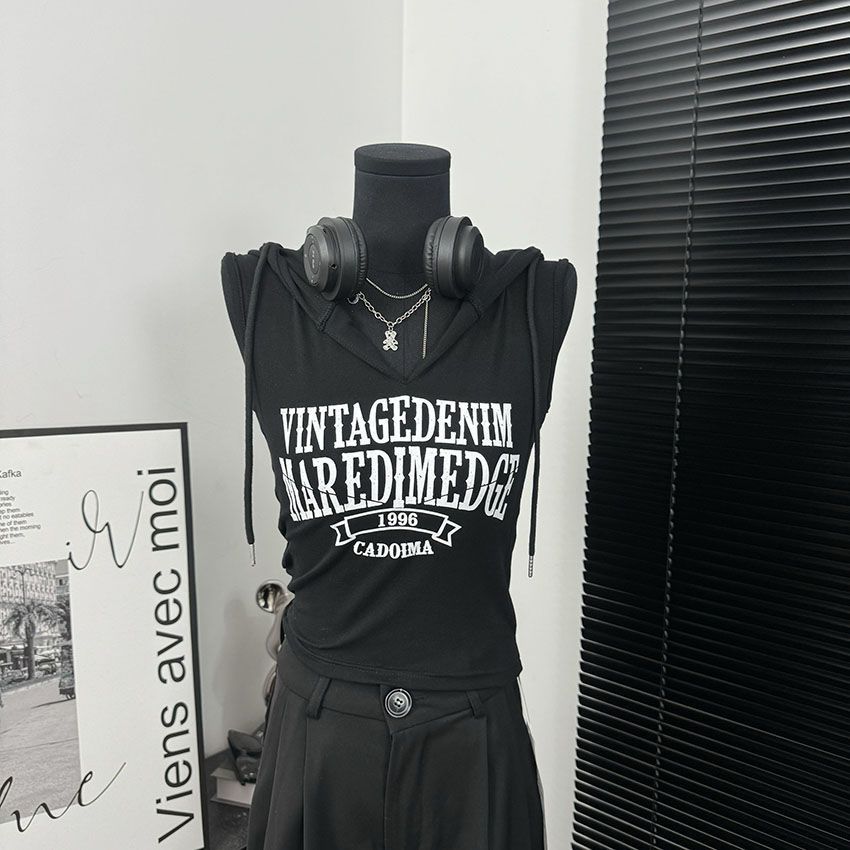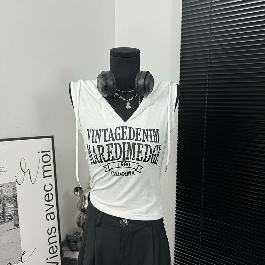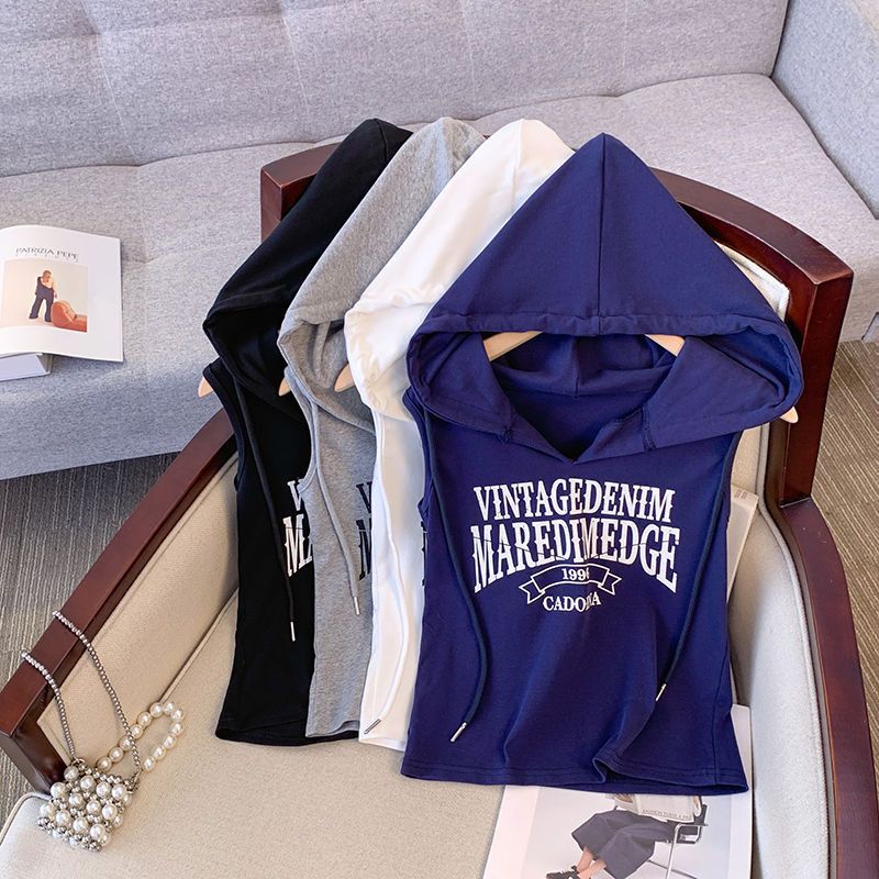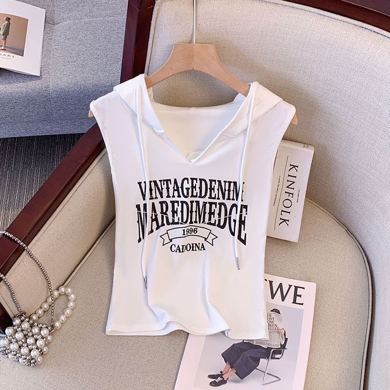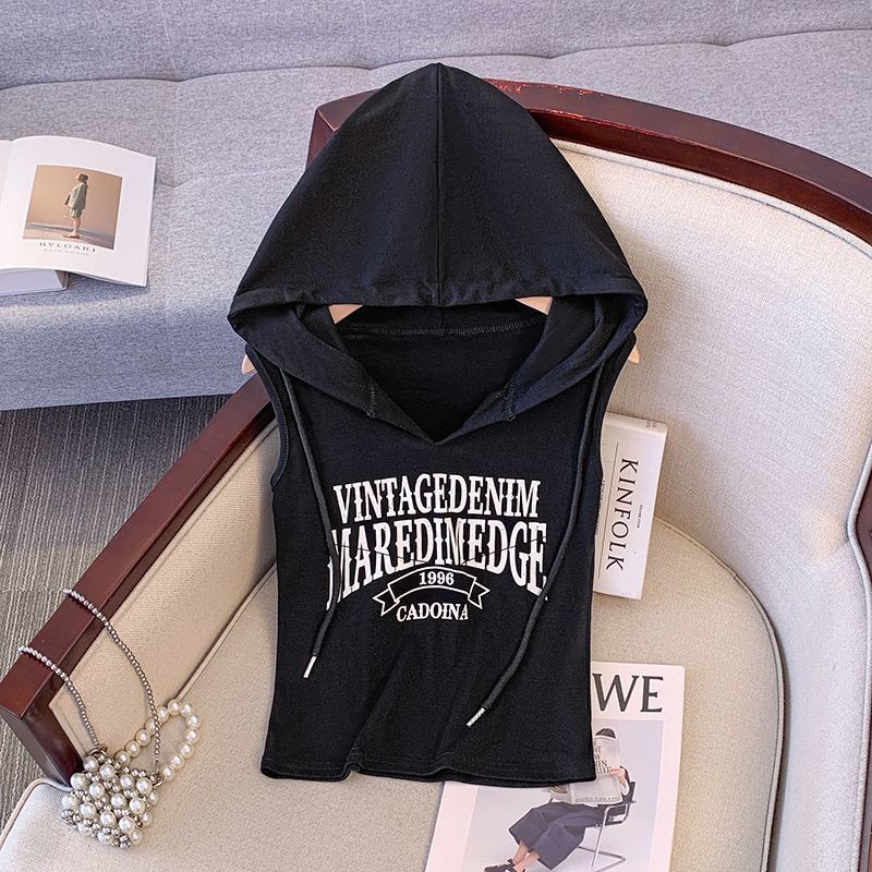 复古字母印花背心吊带女夏季新款连帽无袖运动上衣