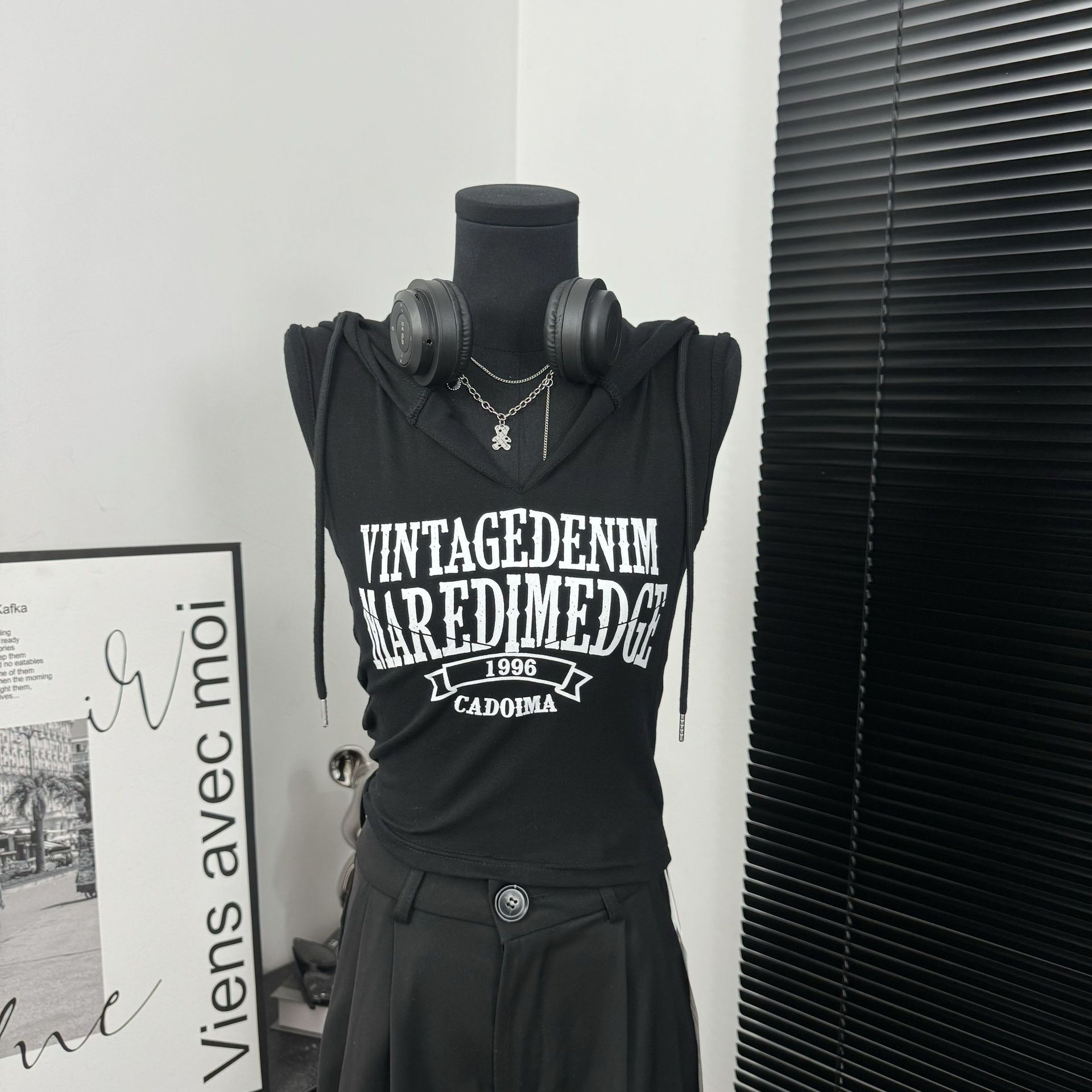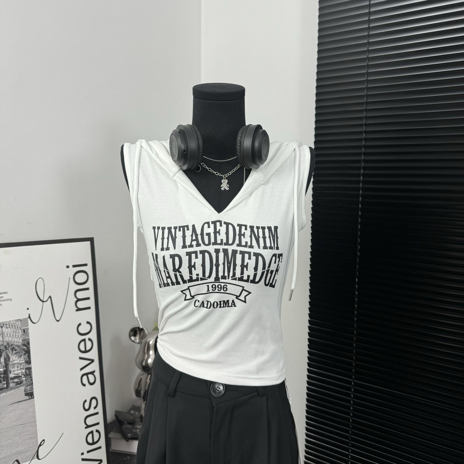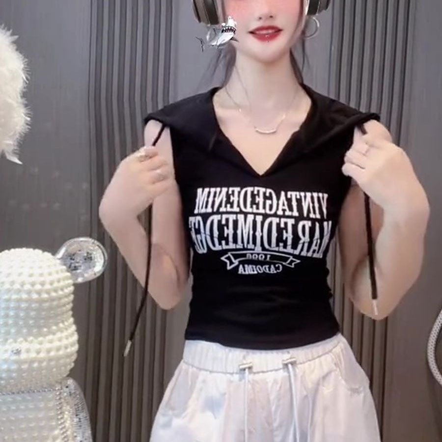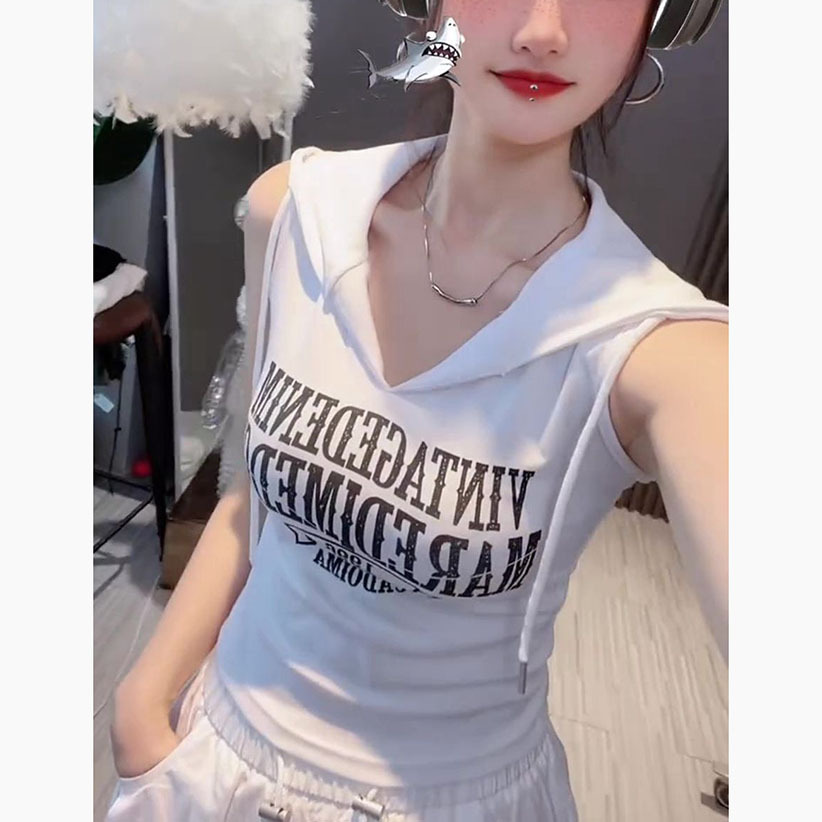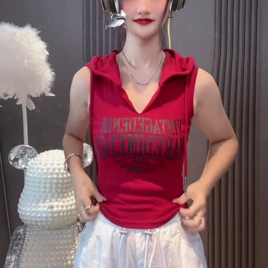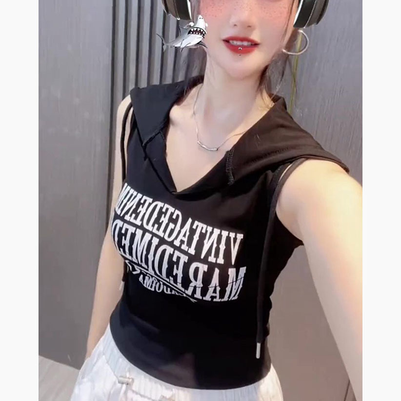 新款撞色字母连帽无袖背心女性感甜辣妹修身短款上衣