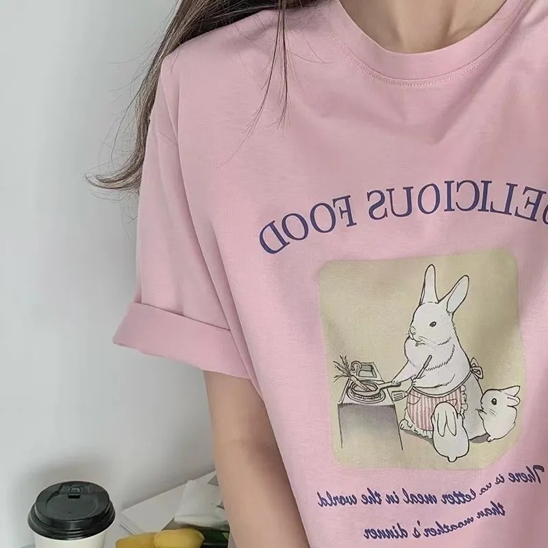 超手感莫代尔韩版小兔甜美宽松百搭卡通印花休闲短袖t恤女