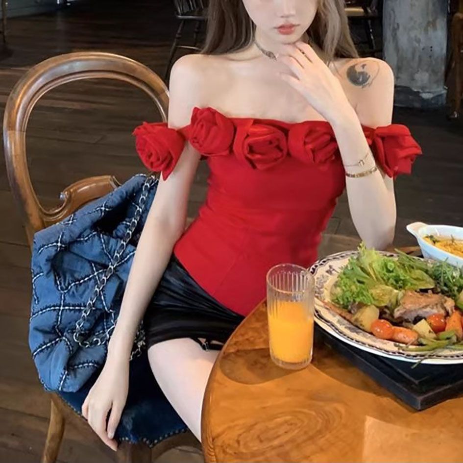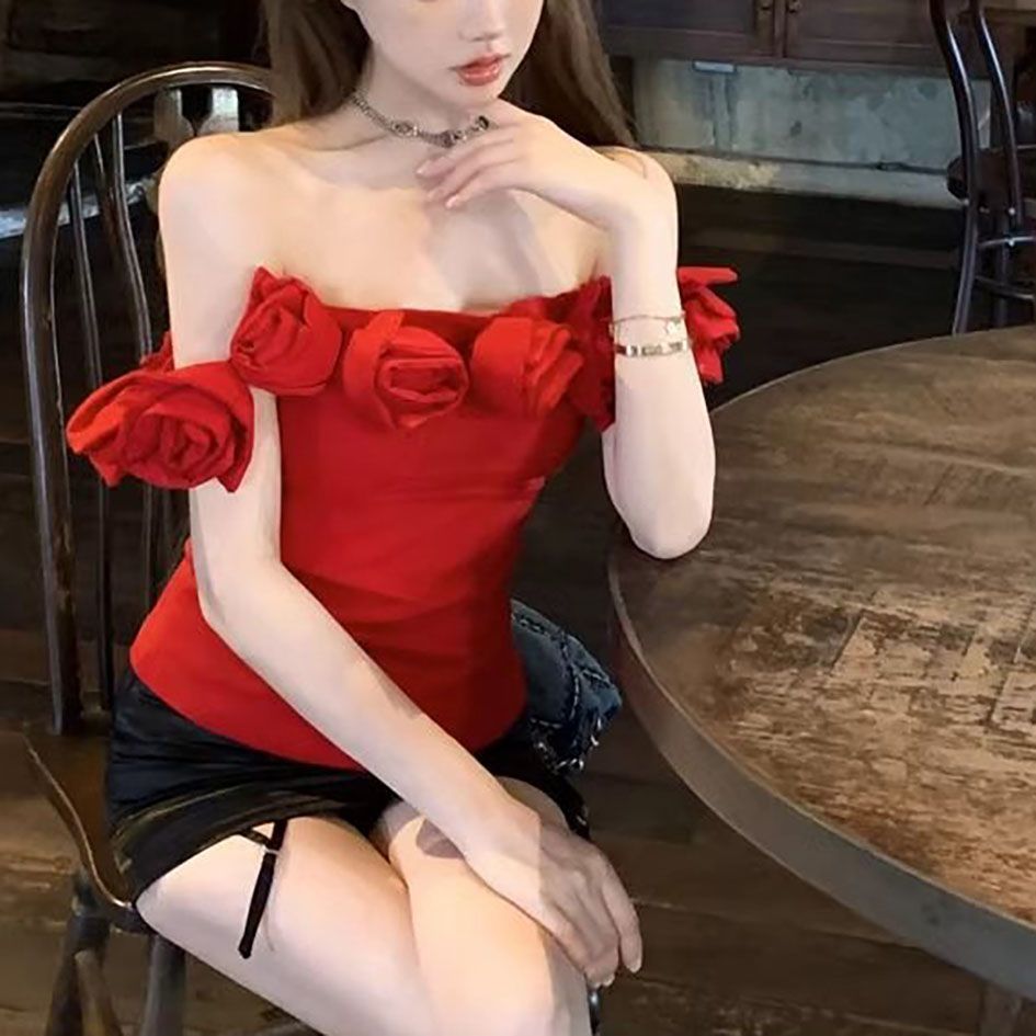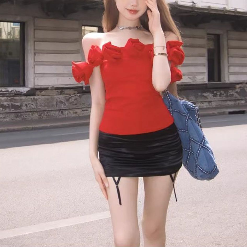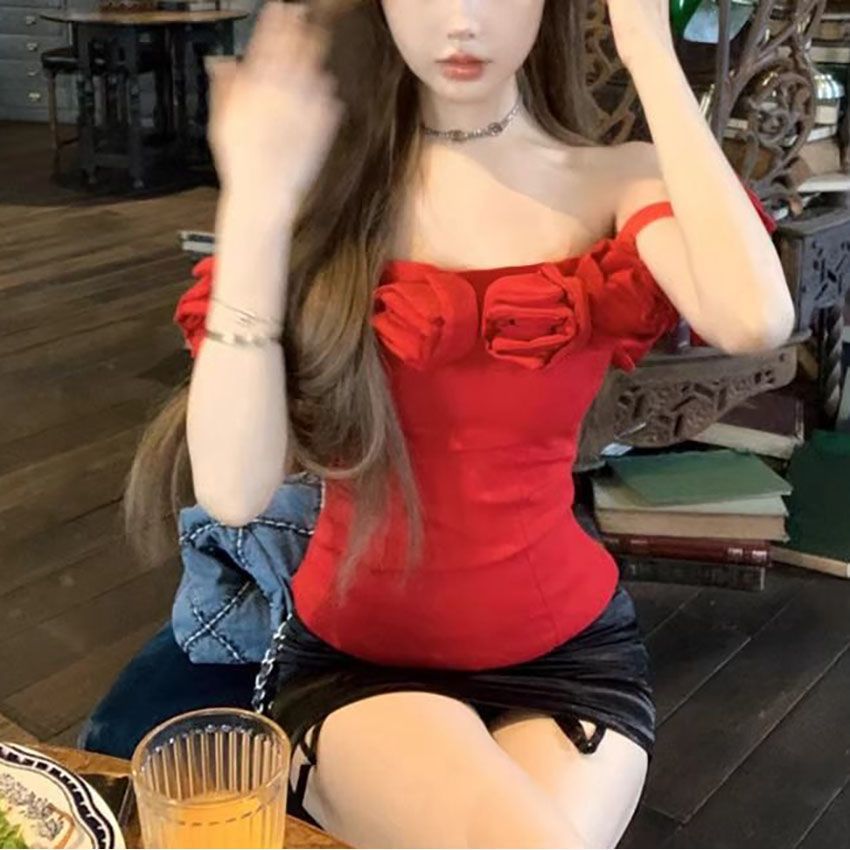 【月销10万】立体花朵一字露肩背心女夏短款修身显瘦抹胸吊带上衣