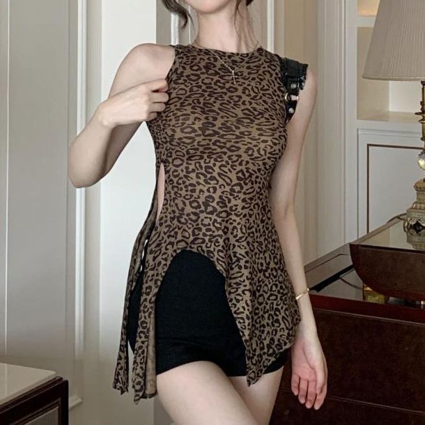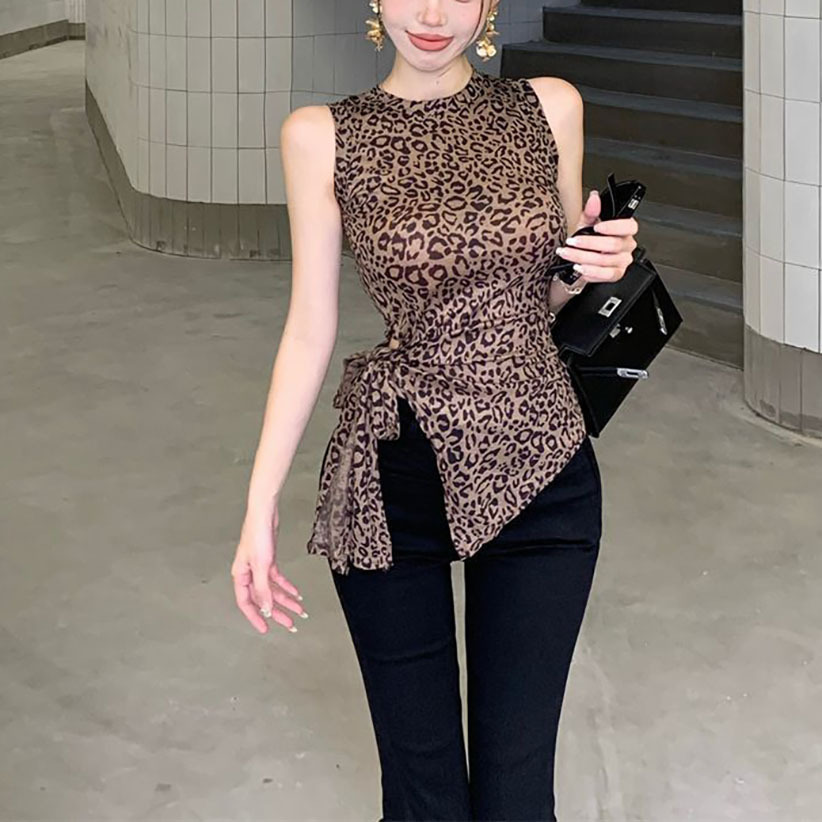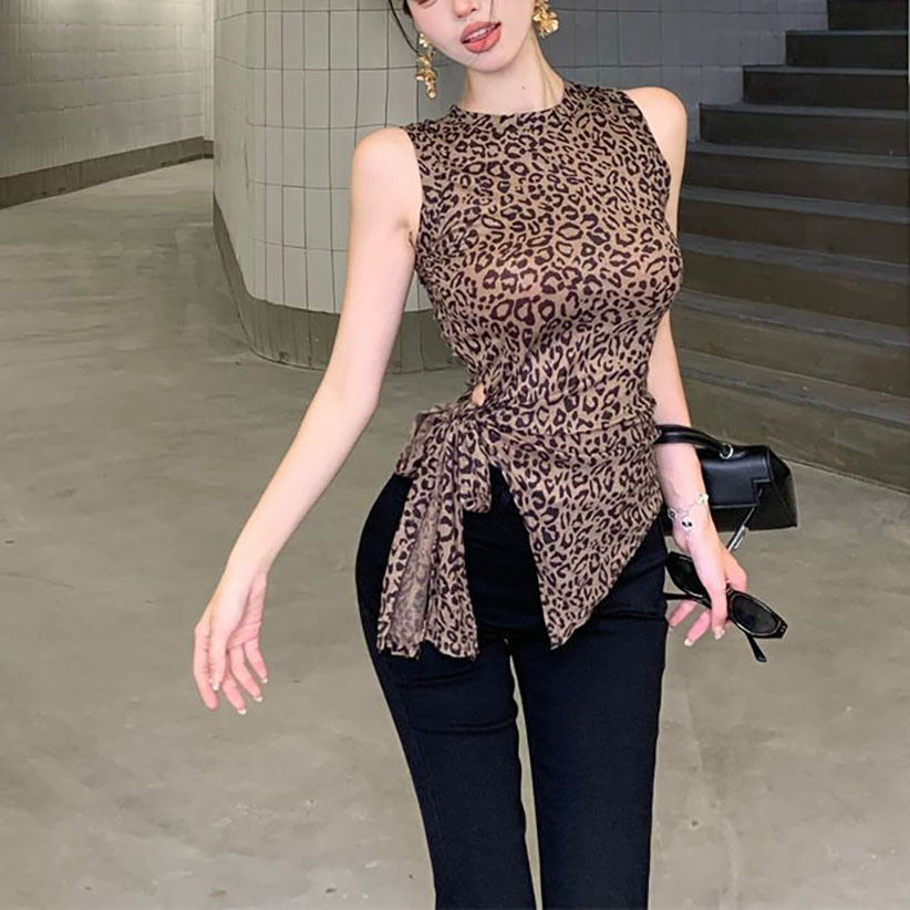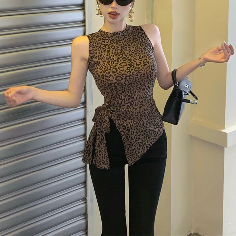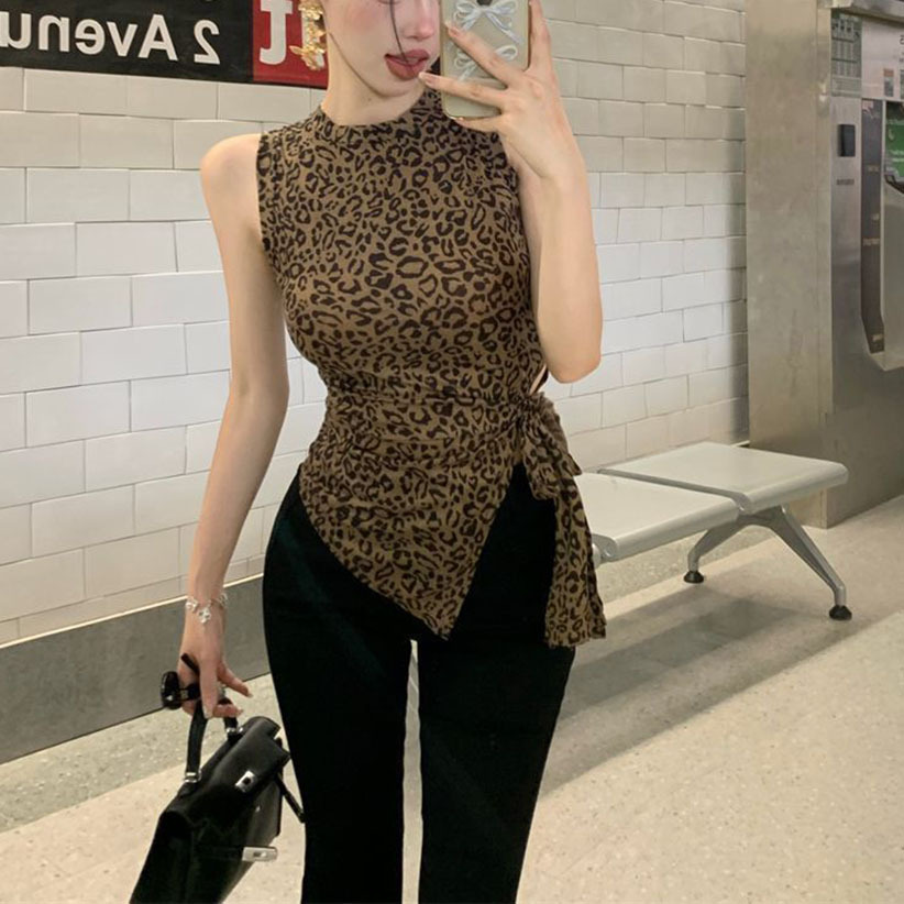 泰国东南亚复古印花豹纹吊带背心女夏季辣妹绑带不规则修身上衣