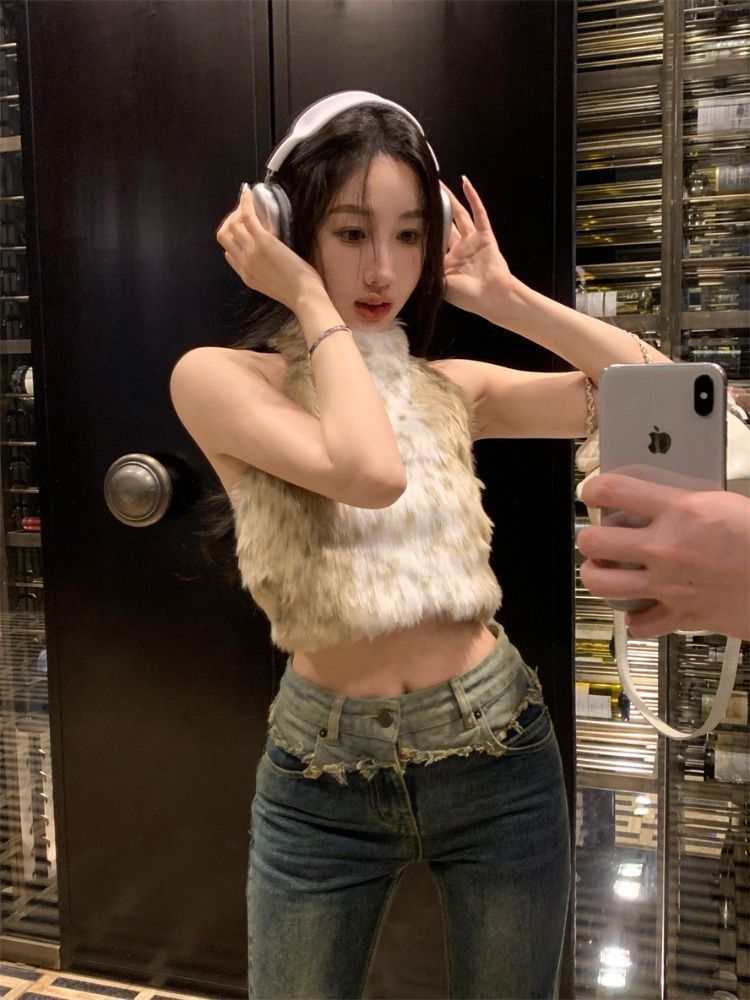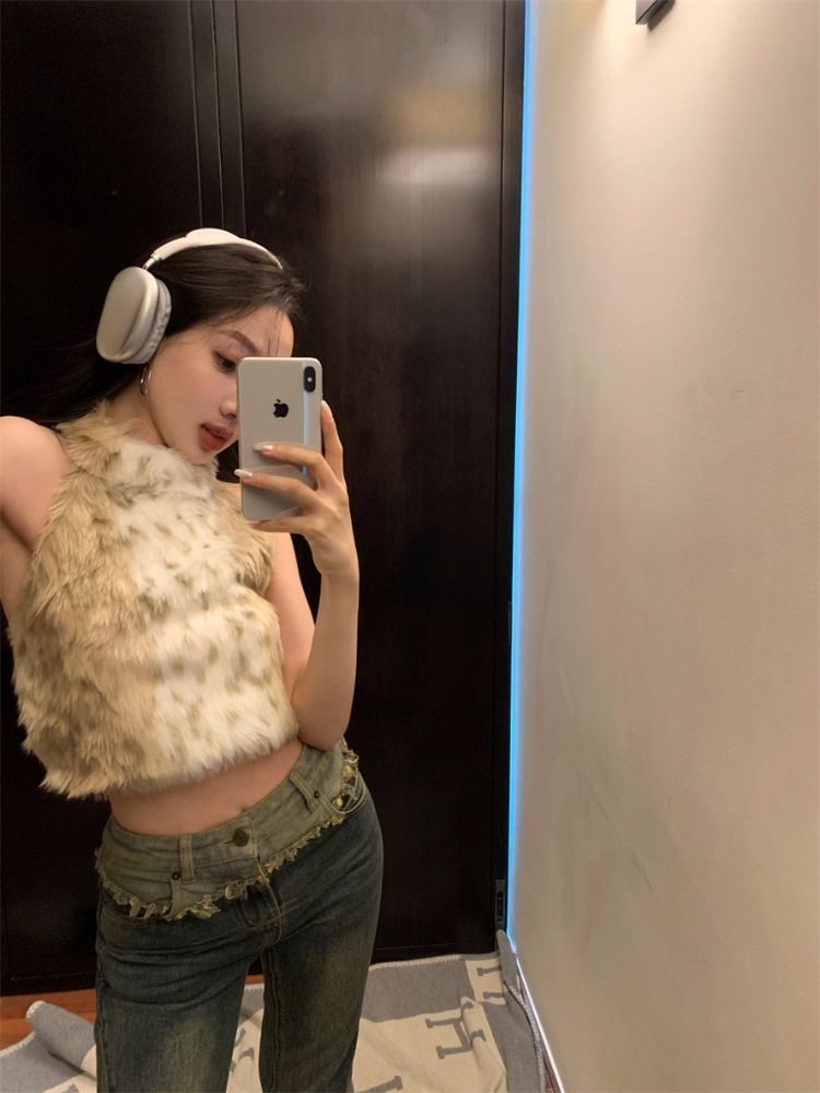 【跨境批发】辣妹豹纹毛毛挂脖背心女性感修身短款露背内搭吊带