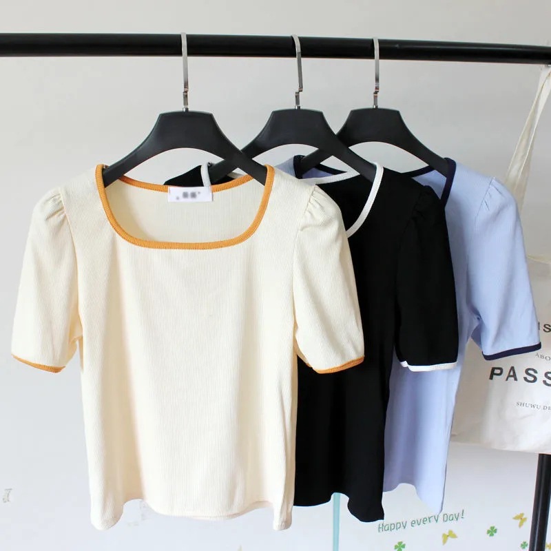 正肩短袖T恤夏新款设计感小众方领百搭洋气冰丝螺纹打底上衣