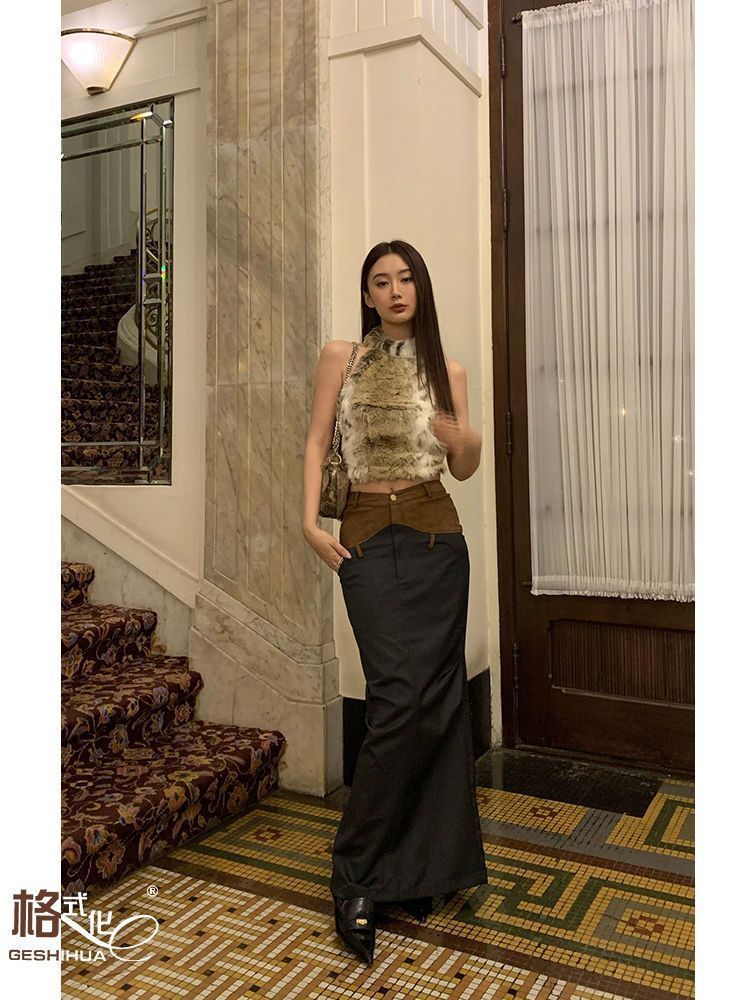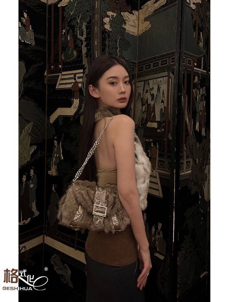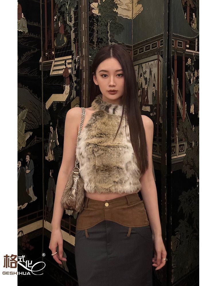 【跨境批发】豹纹挂脖削肩小背心女毛绒绒短款露脐外穿度假上衣