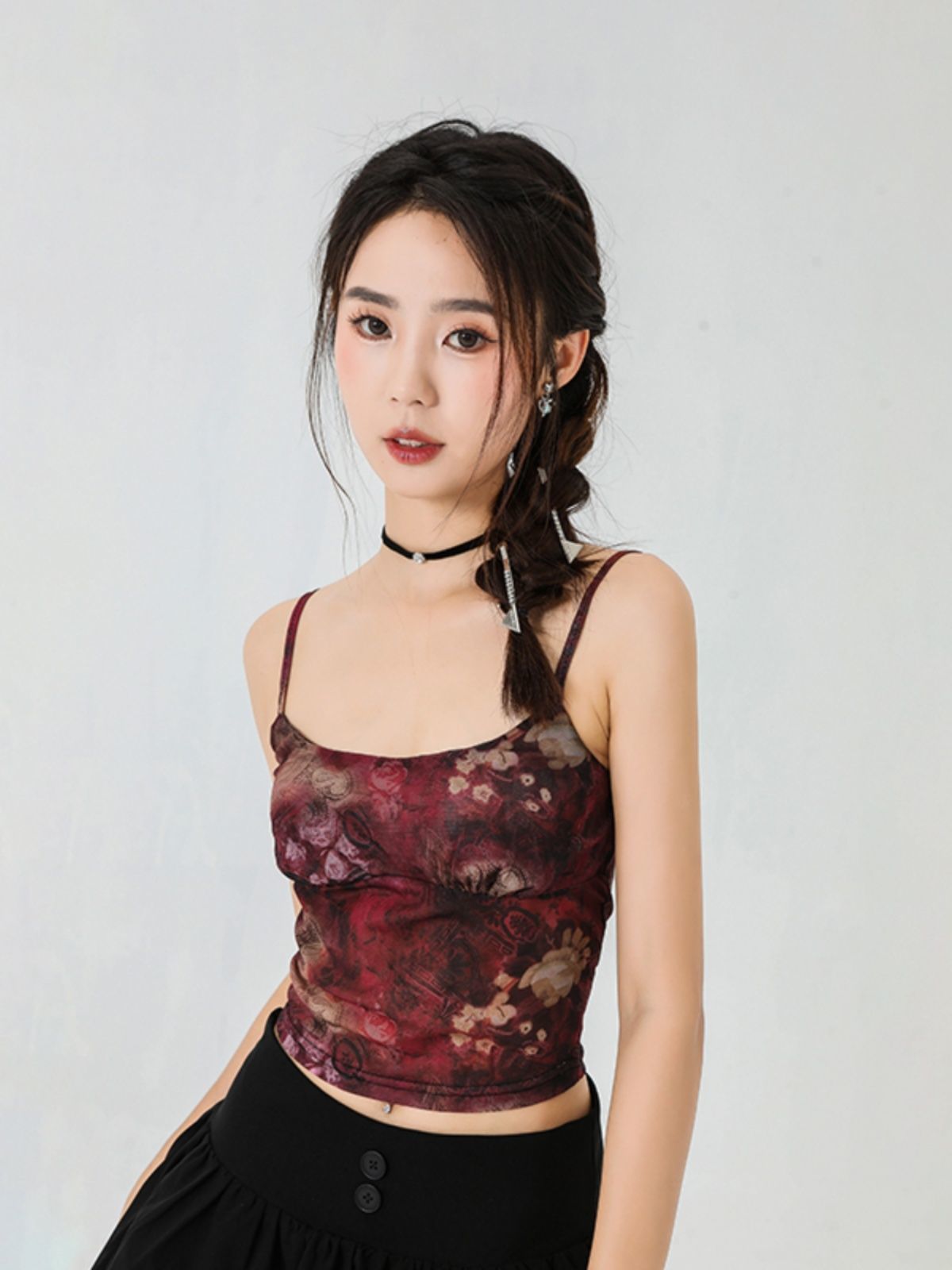 泰国酒红色扎染印花网纱吊带露背高级感秋冬新款内搭短款高腰背心