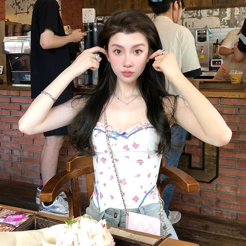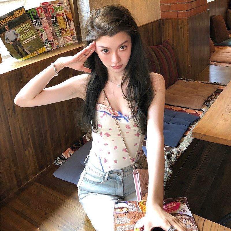 泰国甜美风裹胸蝴蝶结碎花修身收腰吊带上衣女夏季新款减龄可爱潮