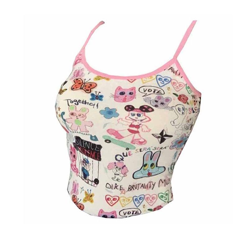 卡通涂鸦印花吊带背心甜美内搭外穿气质露背短款上衣