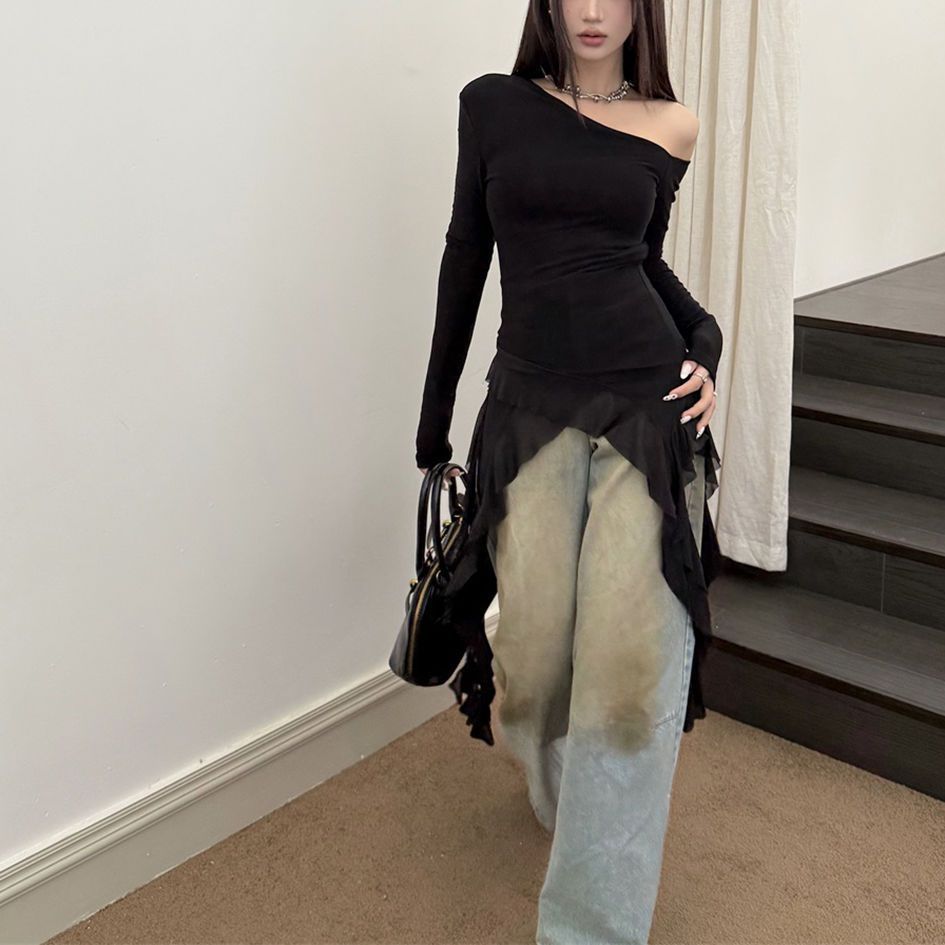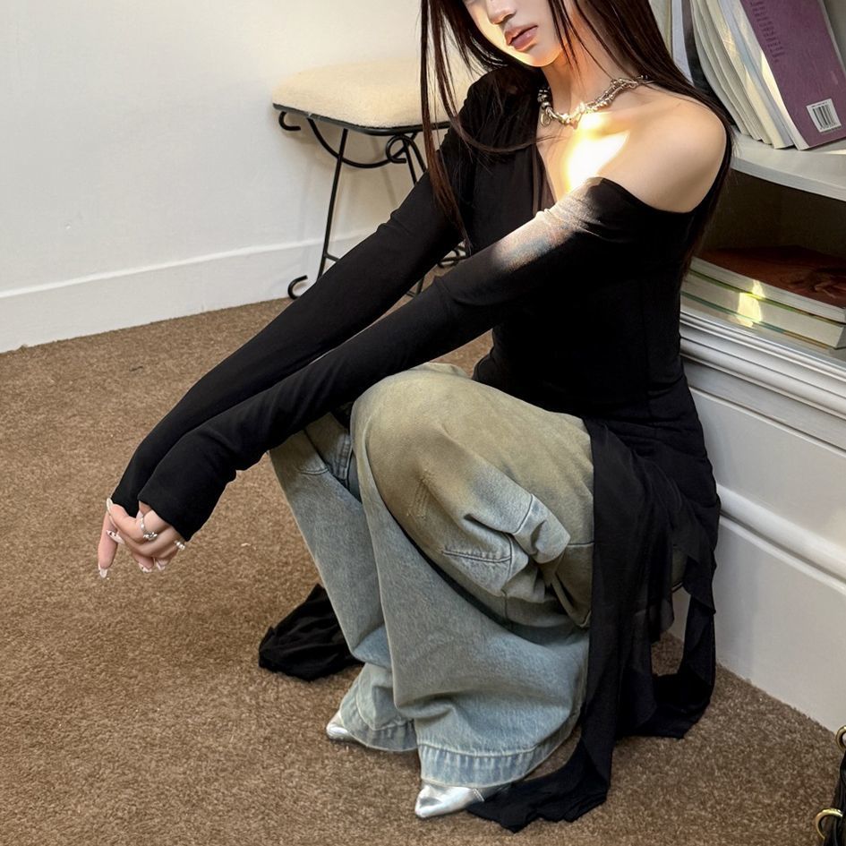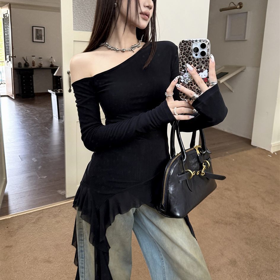 【月销10万】2025纯欲露肩T恤设计感辣妹背心不规则飘带打底上衣