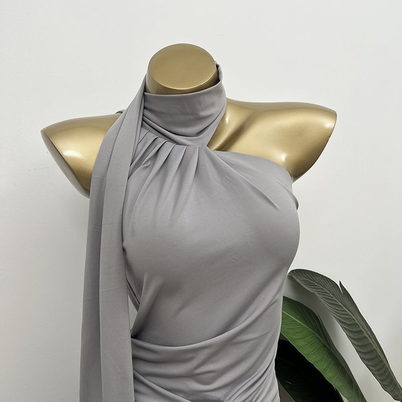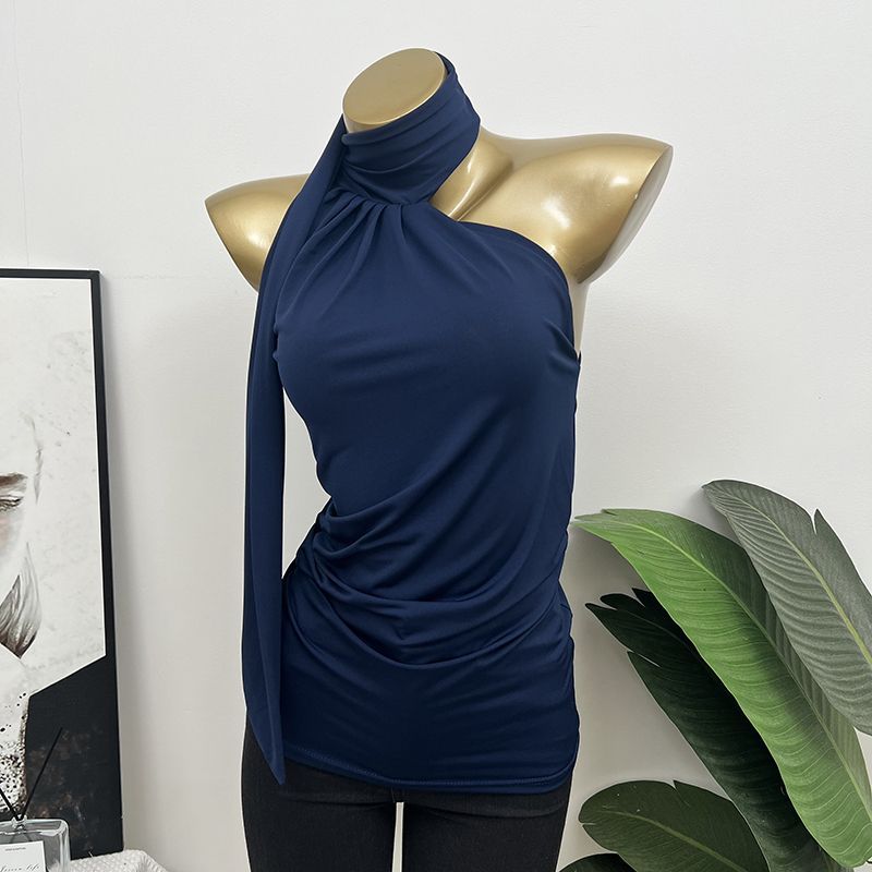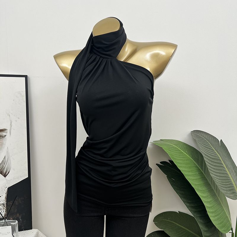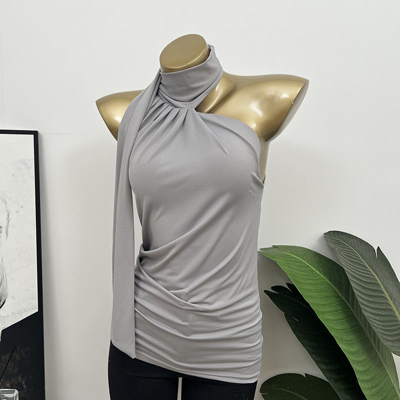 【月销10万】纯色褶皱气质挂脖背心露锁骨女人味上衣露肩无袖T恤