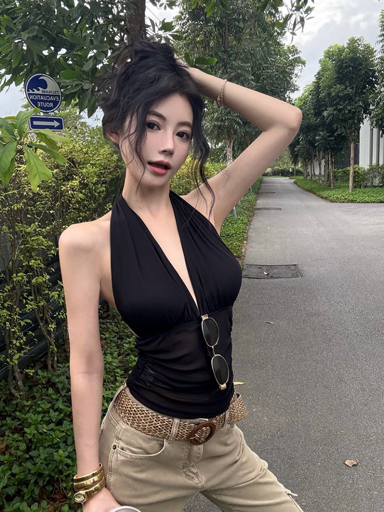 【全网低价】辣妹挂脖黑色吊带背心女低v领无袖露背网纱短上衣