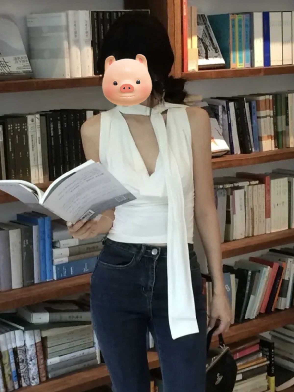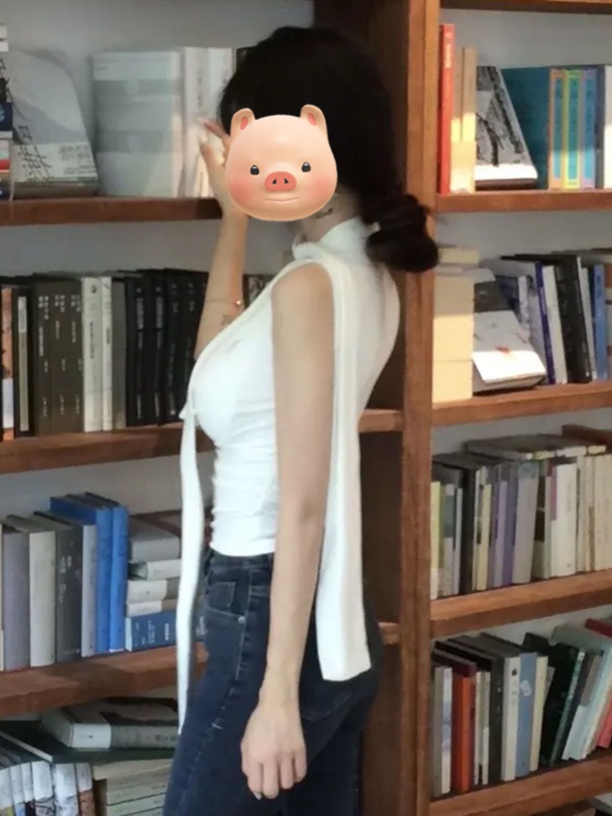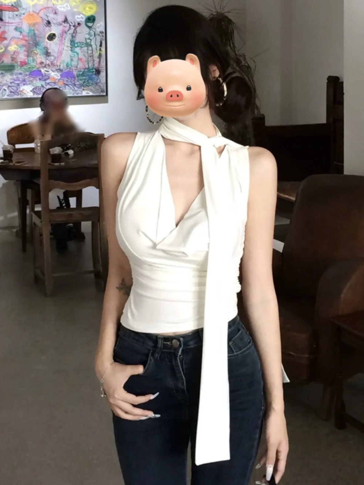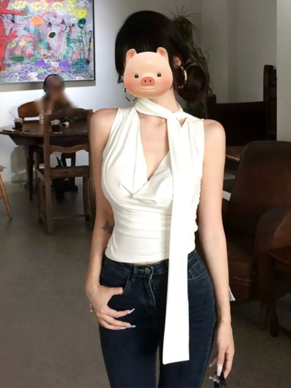 纯欲白色v领无袖挂脖背心夏季吊带别致荡领飘带上衣