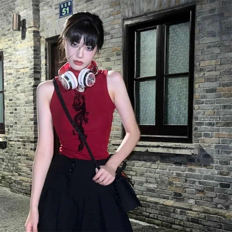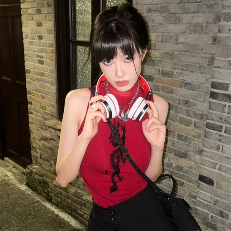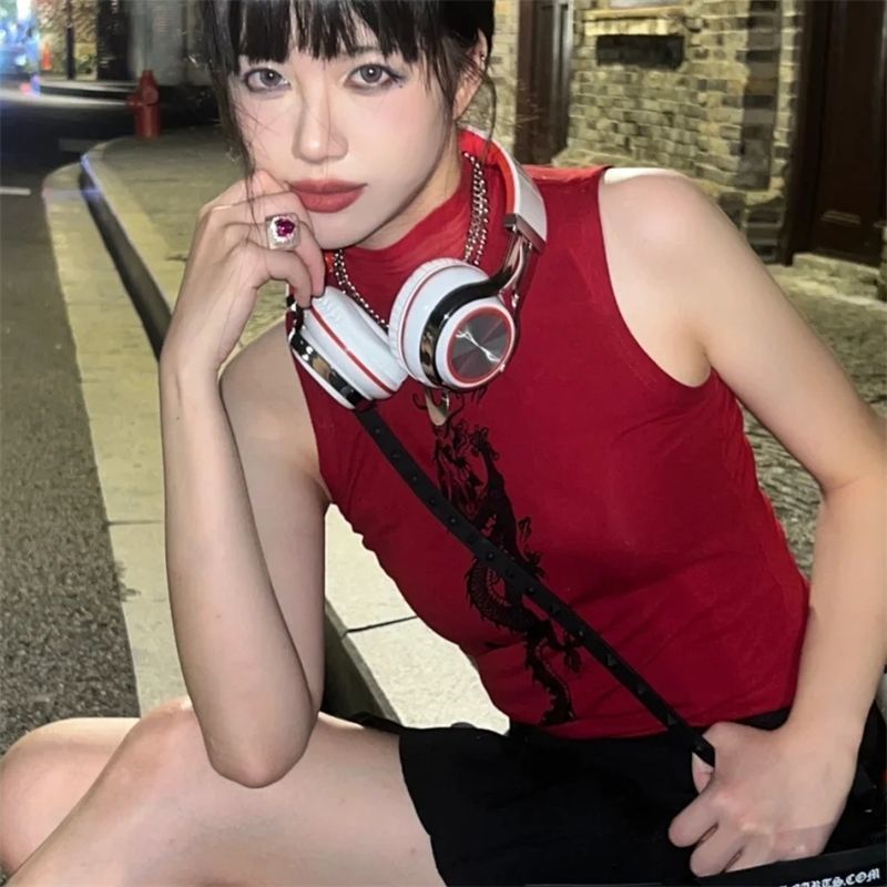 2025夏季新款美式复古y2k亚文化朋克风上衣T恤无袖背心高领内搭女
