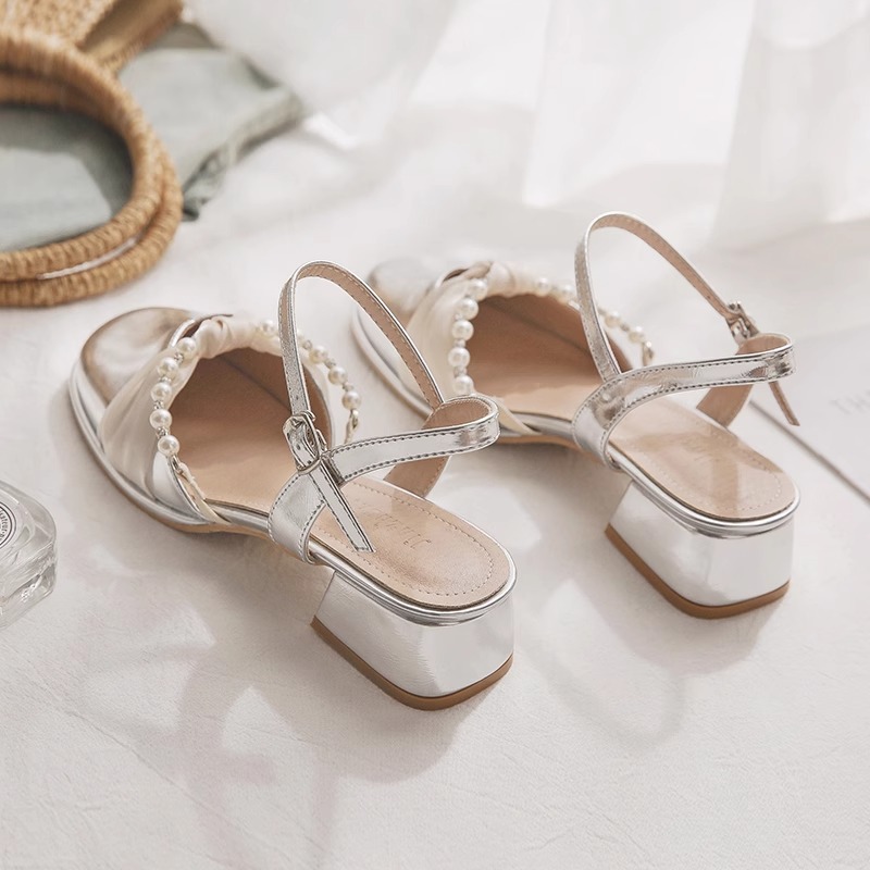 一字带包头凉鞋女款法式绝美银色仙女风粗跟配裙子的凉鞋女中跟