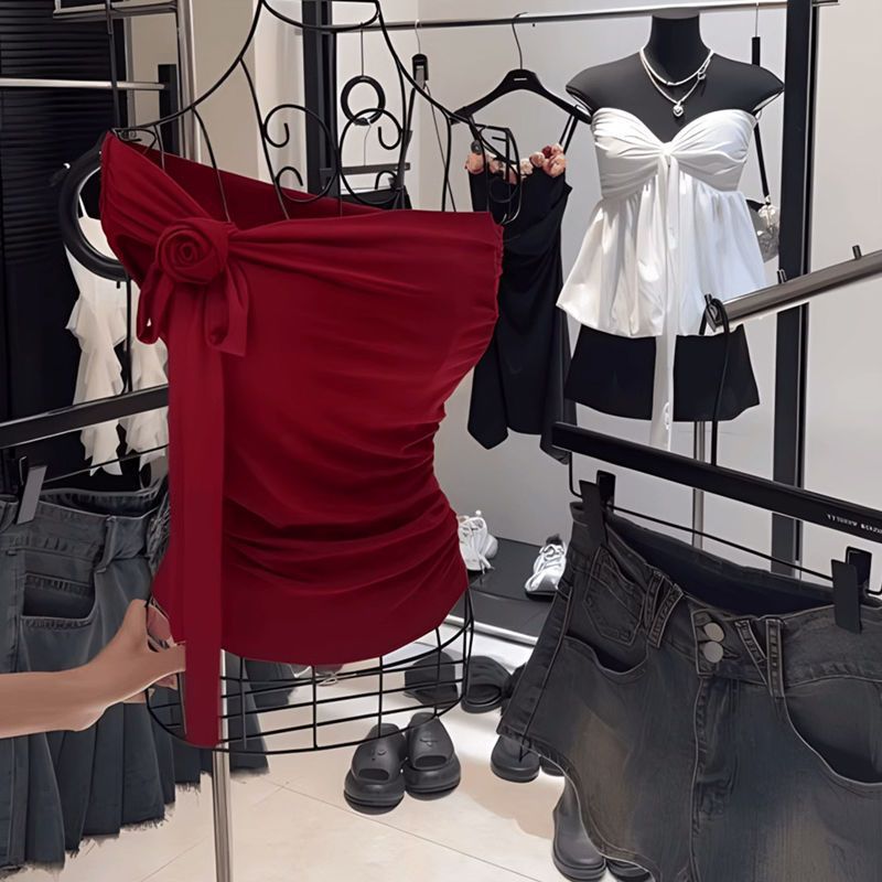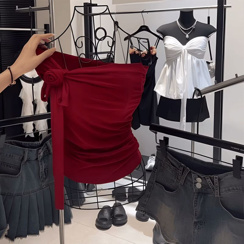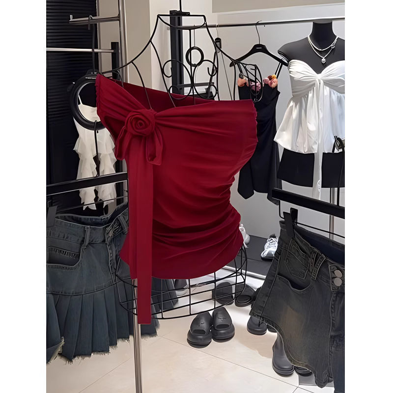 【月销10万】甜辣玫瑰花朵一字肩抹胸背心T恤夏修身别致辣妹上衣