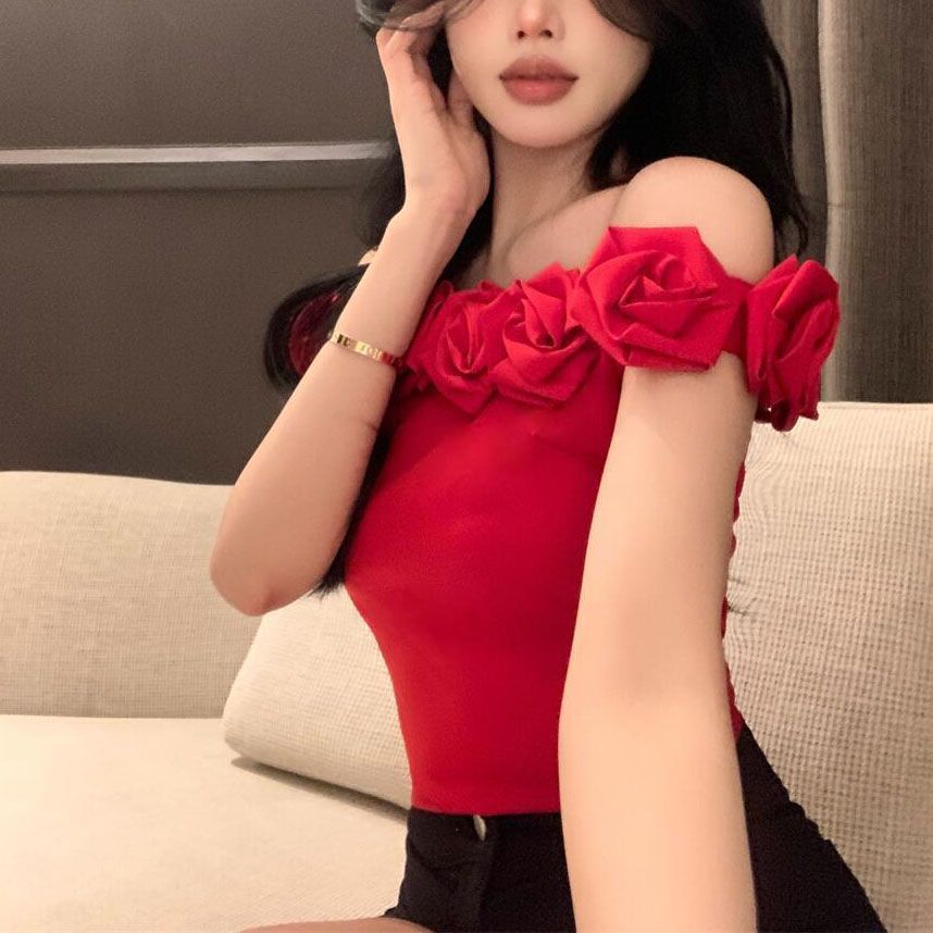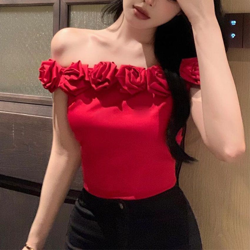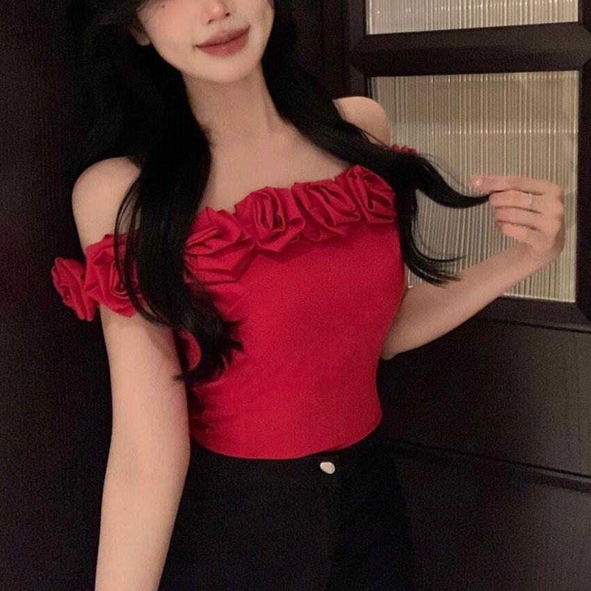 【月销10万】玫瑰花一字肩上衣吊带女夏外穿性感显瘦短款打底背心