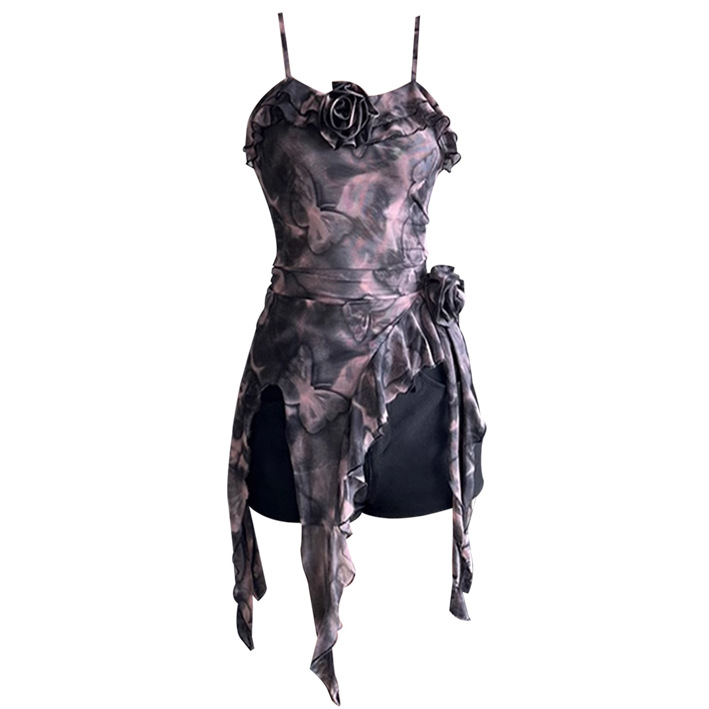 【月销10万】亚文化收腰印花吊带女夏季不规则荷叶边飘带辣妹上衣