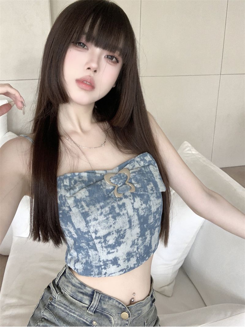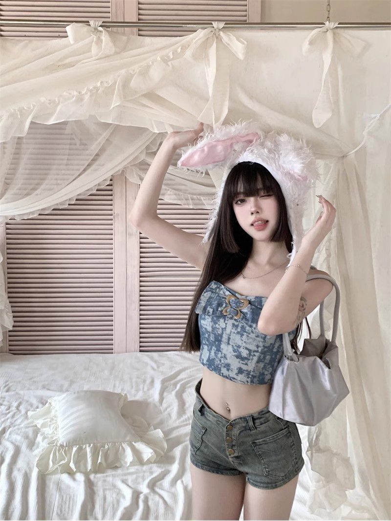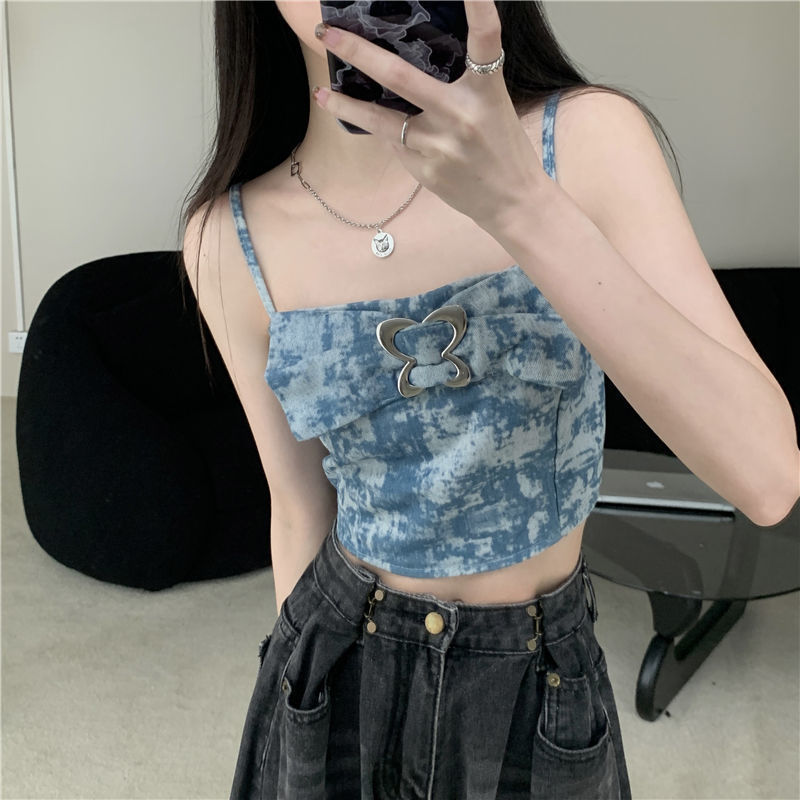 【月销10万】蓝色扎染吊带背心夏季甜辣妹蝴蝶结复古露背短款上衣