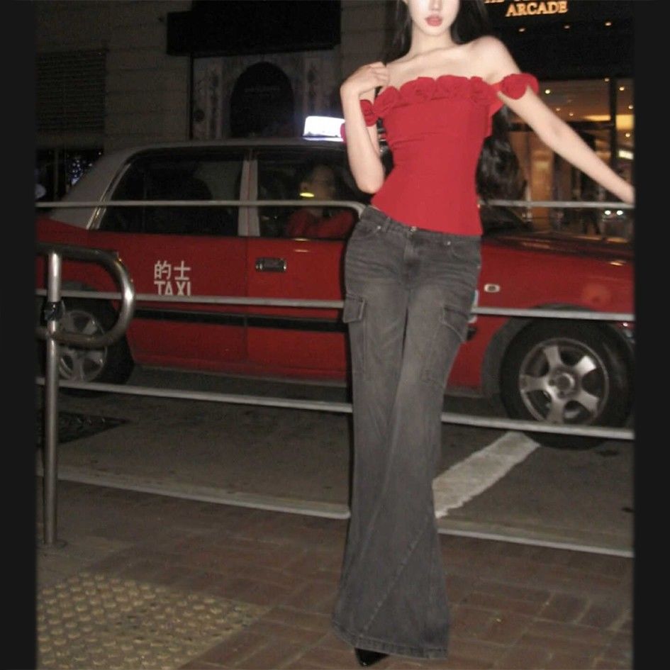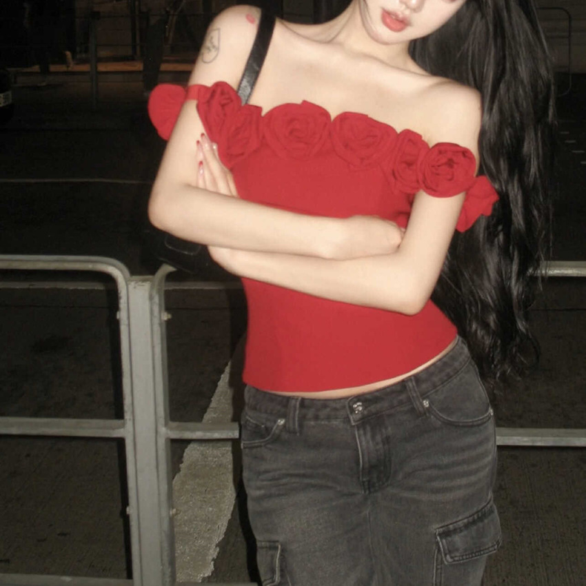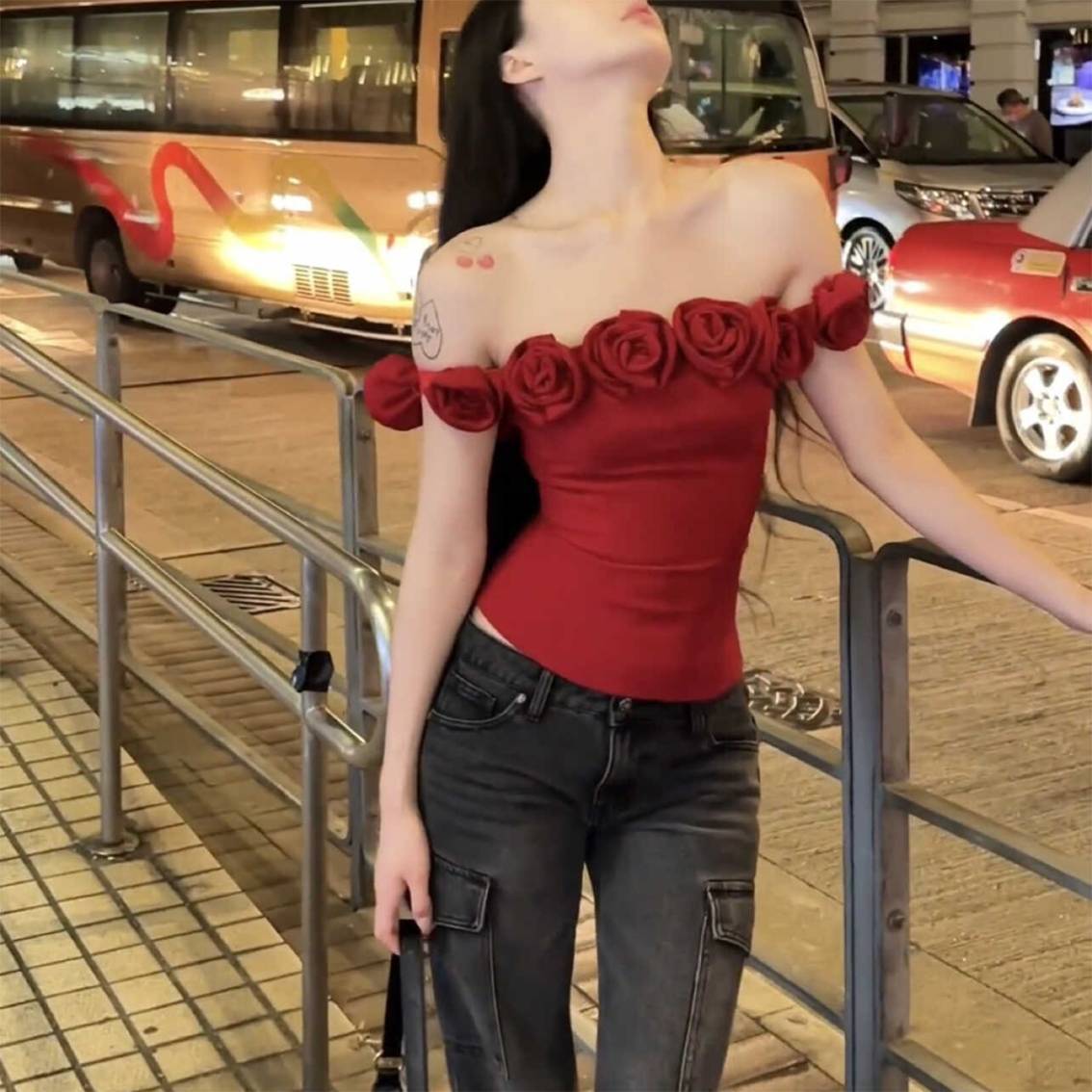 立体玫瑰花抹胸上衣女辣妹绝美露肩锁骨红色吊带背心