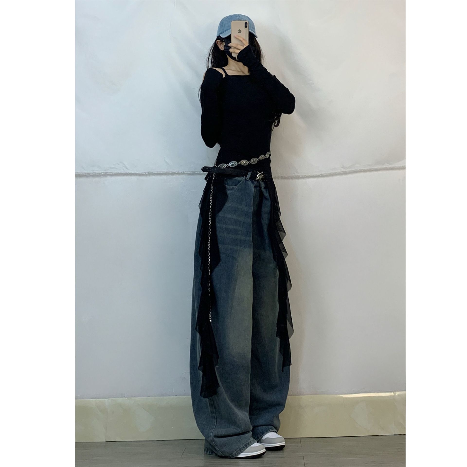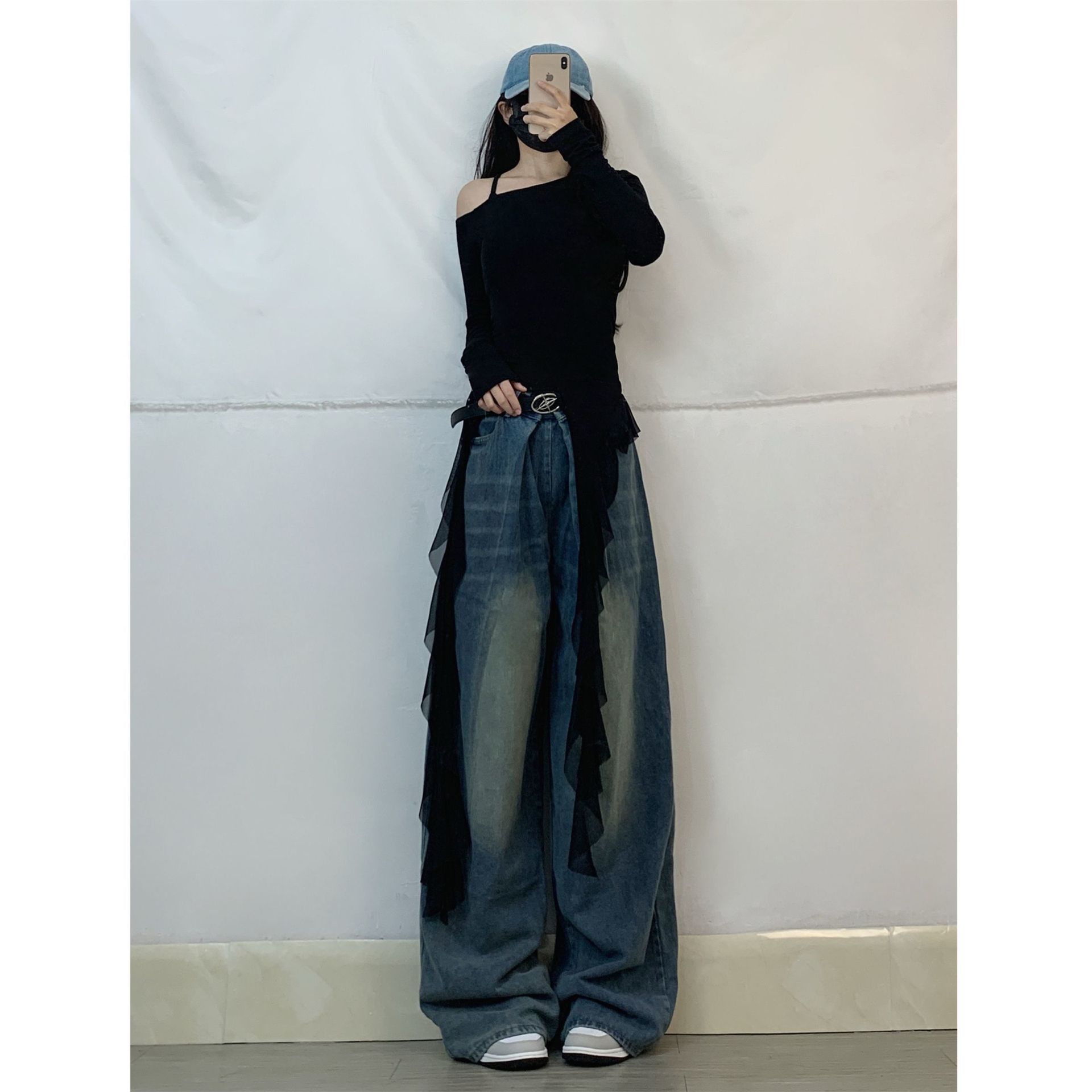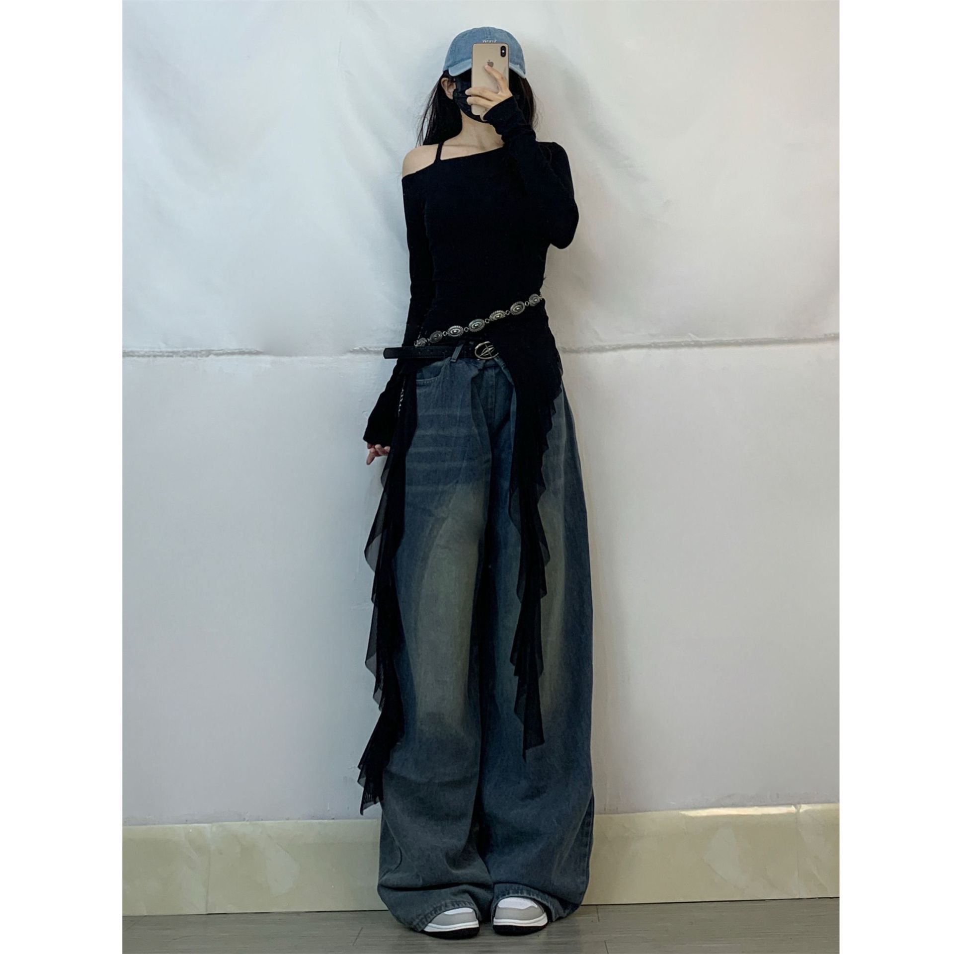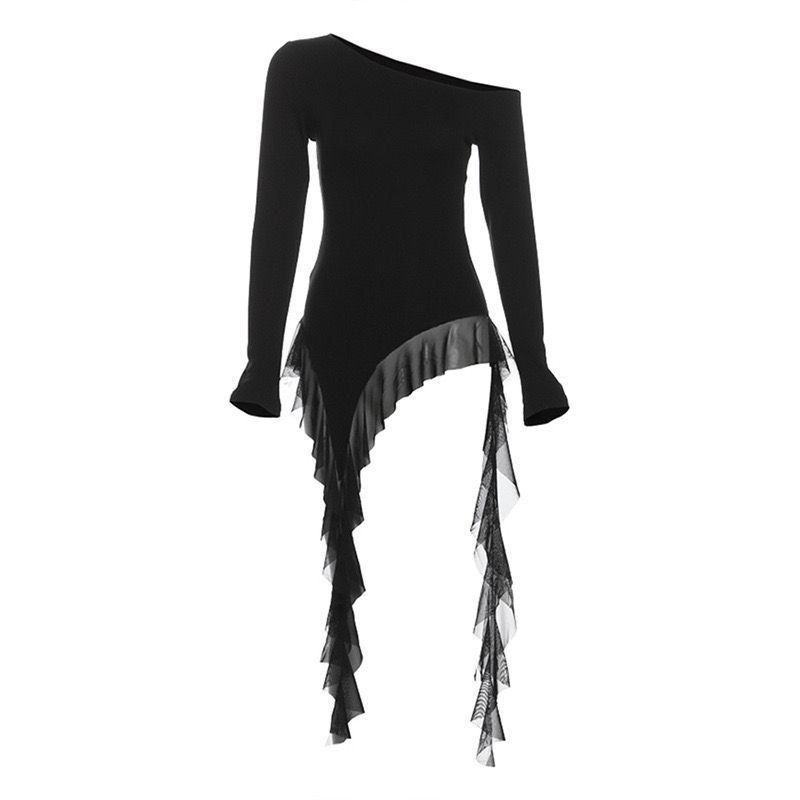 辣妹长袖T恤女黑色修身斜肩飘带显瘦露肩上衣爵士舞