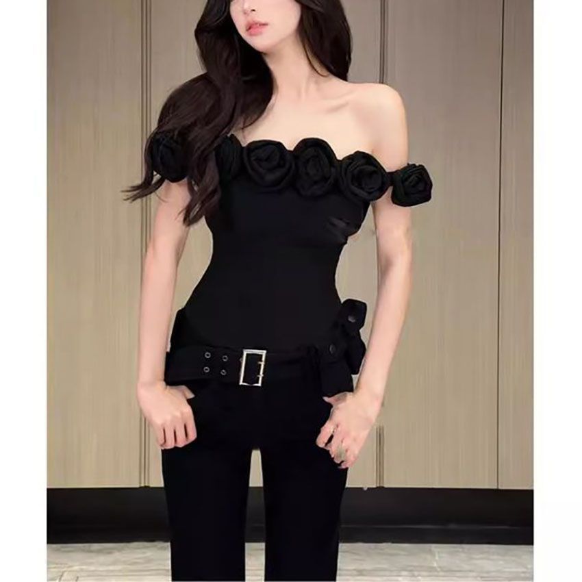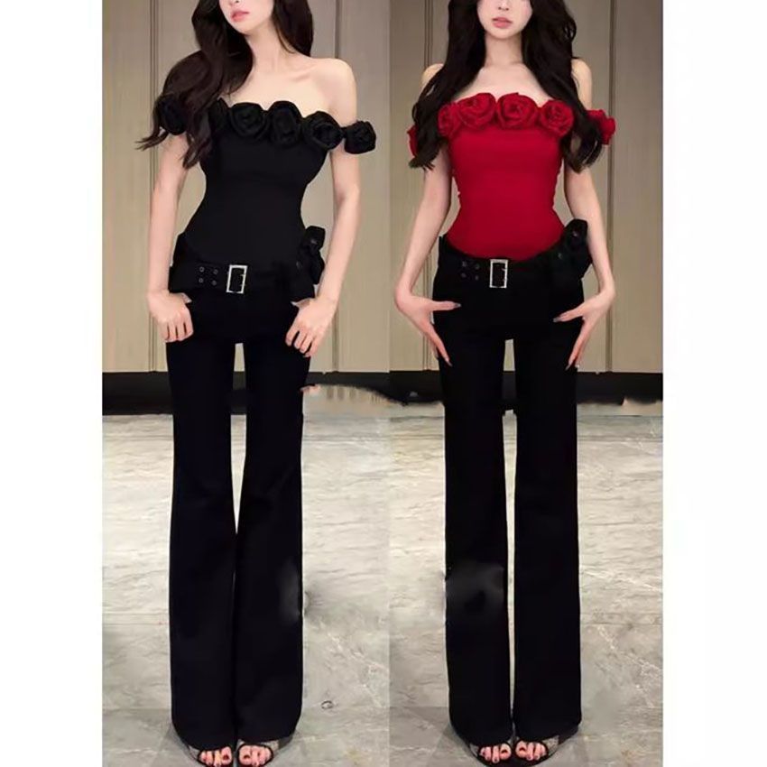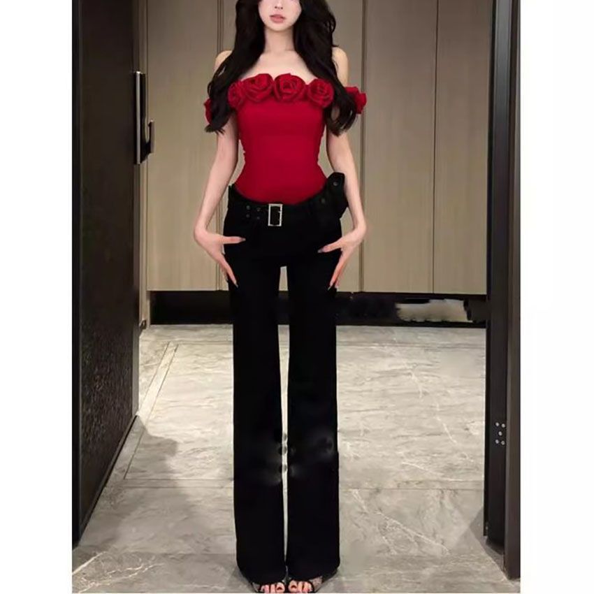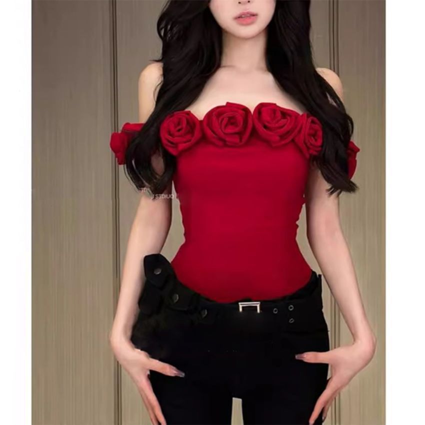 辣妹纯欲红色立体花朵露肩女夏季高级感绝美修身一字肩短款小上衣