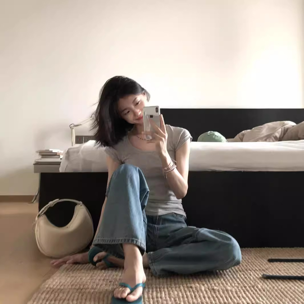 夏季灰色U领漏锁骨T恤女修身显瘦法式高级感短袖简约百搭上衣