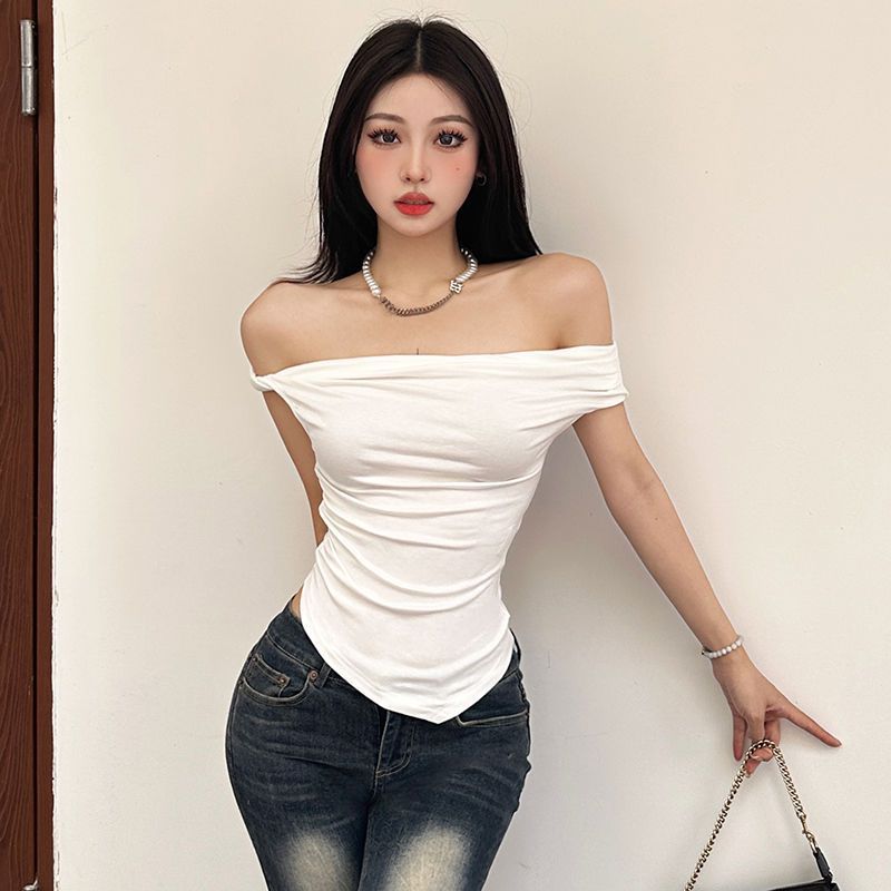 一字领短袖修身T恤女2025夏季字母印花显瘦辣妹百搭短款露肩上衣