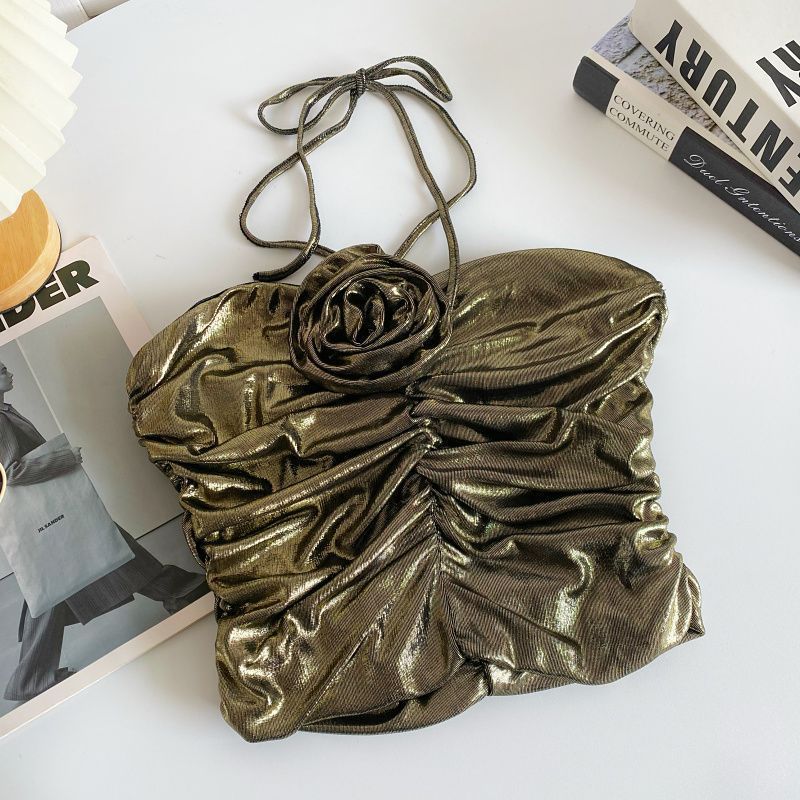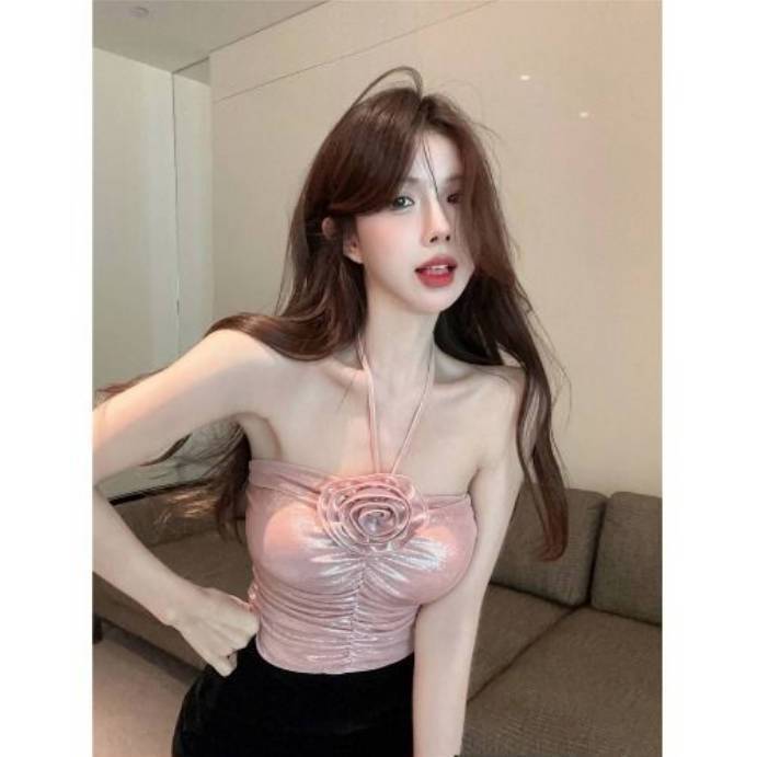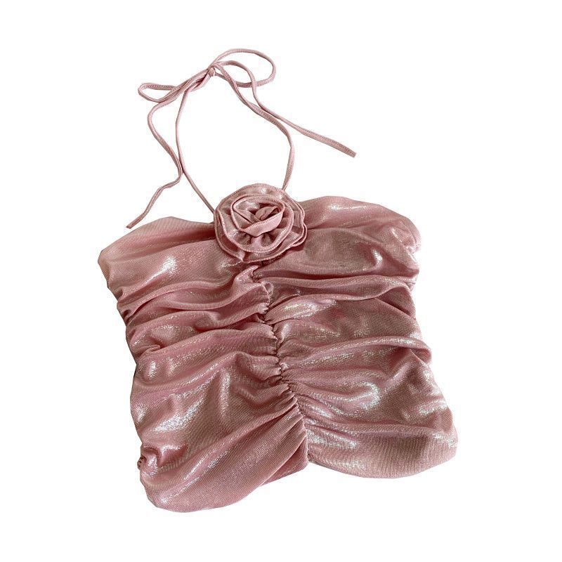 【月销10万】亮面立体花朵挂脖褶皱修身内搭短款吊带背心上衣女