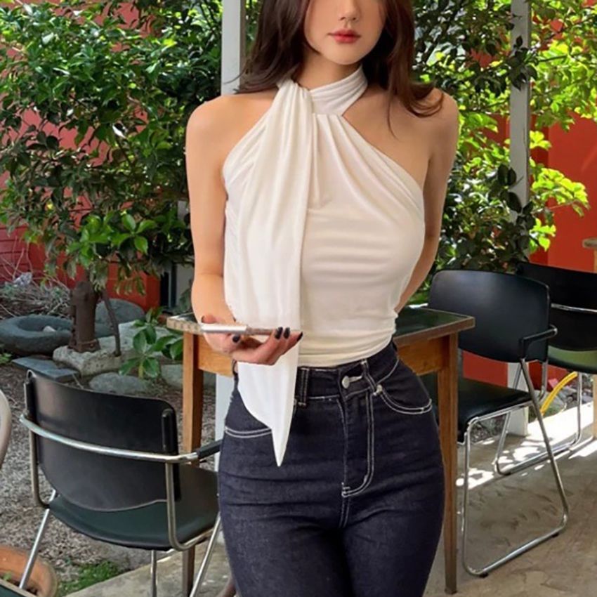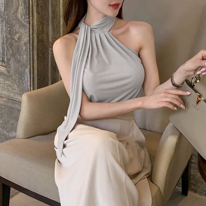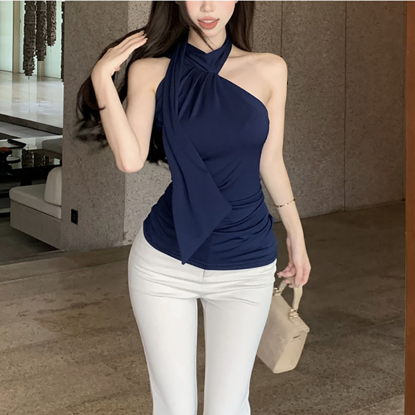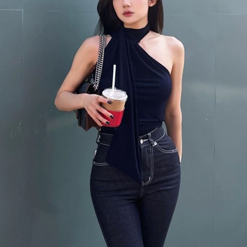 无袖背心女露锁骨气质挂脖女人味显身材飘带上衣潮