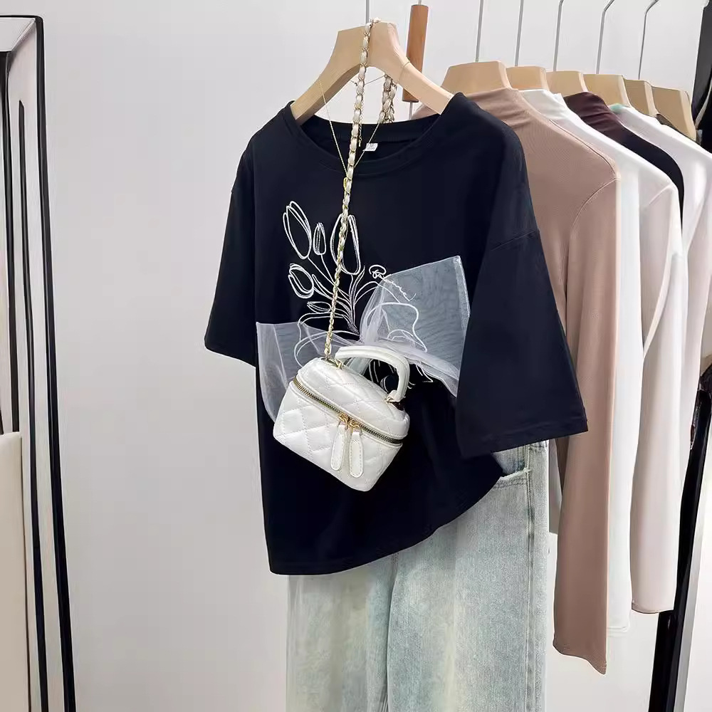 网纱拼接纯棉T恤女短袖2025年新款夏装宽松设计感小众上衣小个子