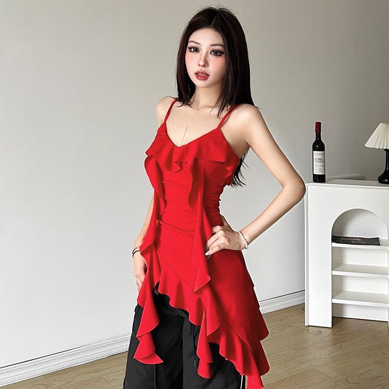 【跨境批发】纯欲辣妹荷叶边拼接不规则吊带背心女显瘦无袖短上衣