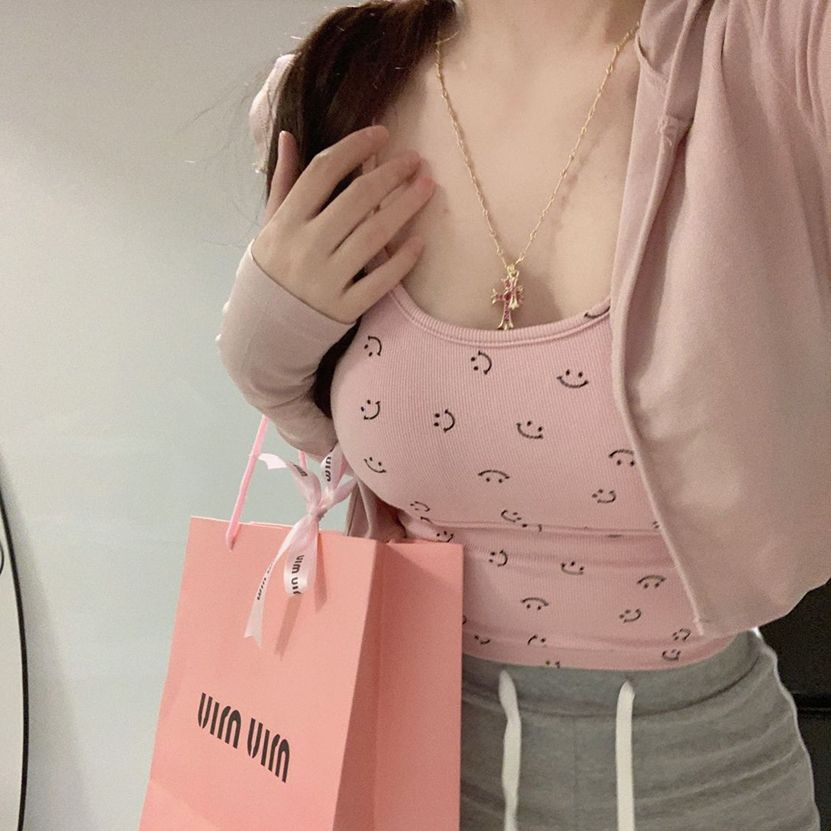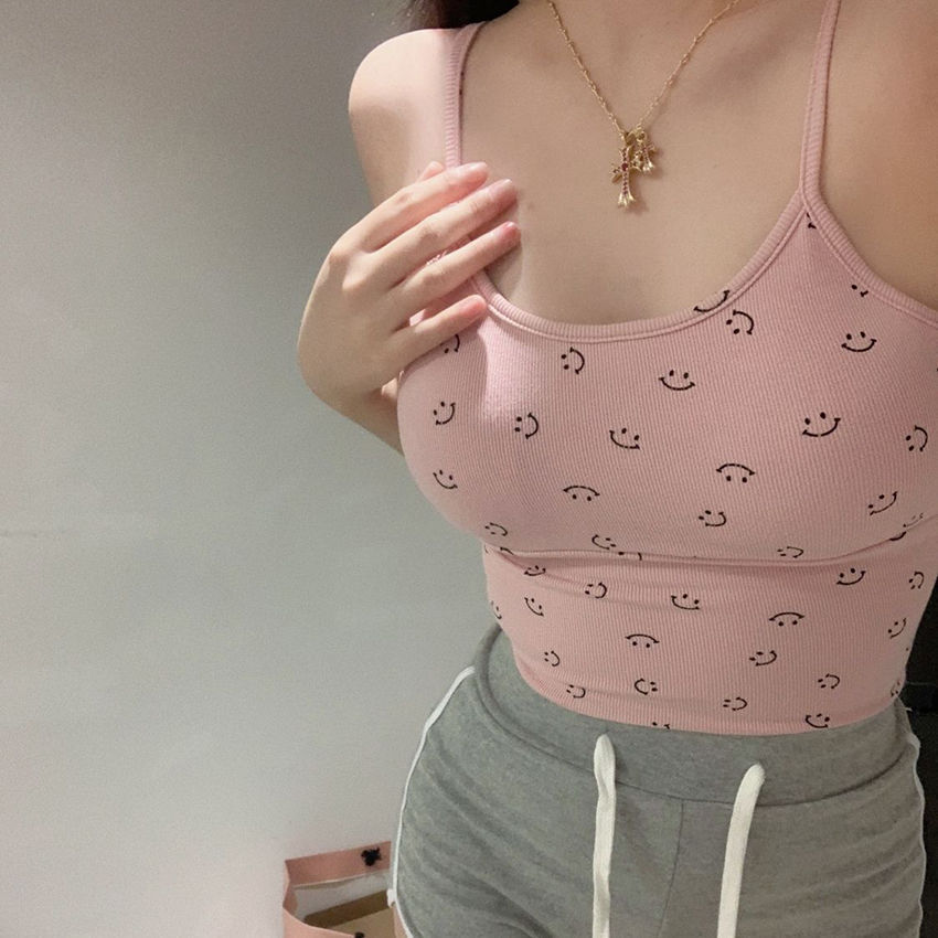 2025新款韩系笑脸设计淡粉吊带甜辣小背心简约印花内搭纯色上衣