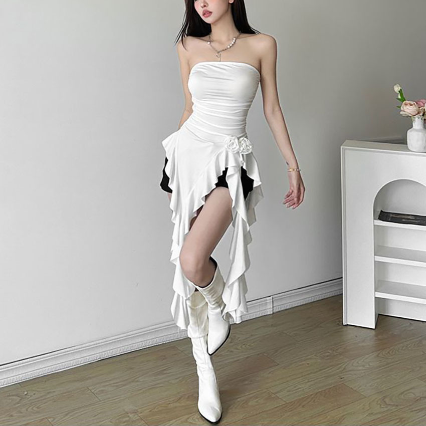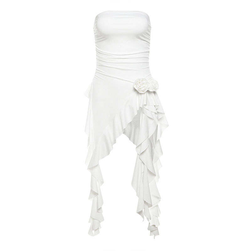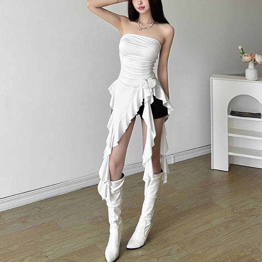 2025纯欲风撩人立体花朵荷叶边拼接抹胸女褶皱显瘦不规则辣妹上衣