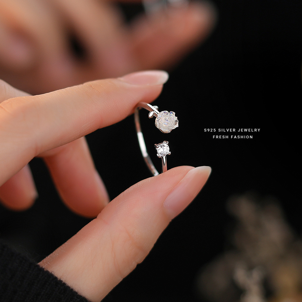 s925纯银清冷玫瑰锆石戒指女轻奢高级小众冷淡风设计感开口戒