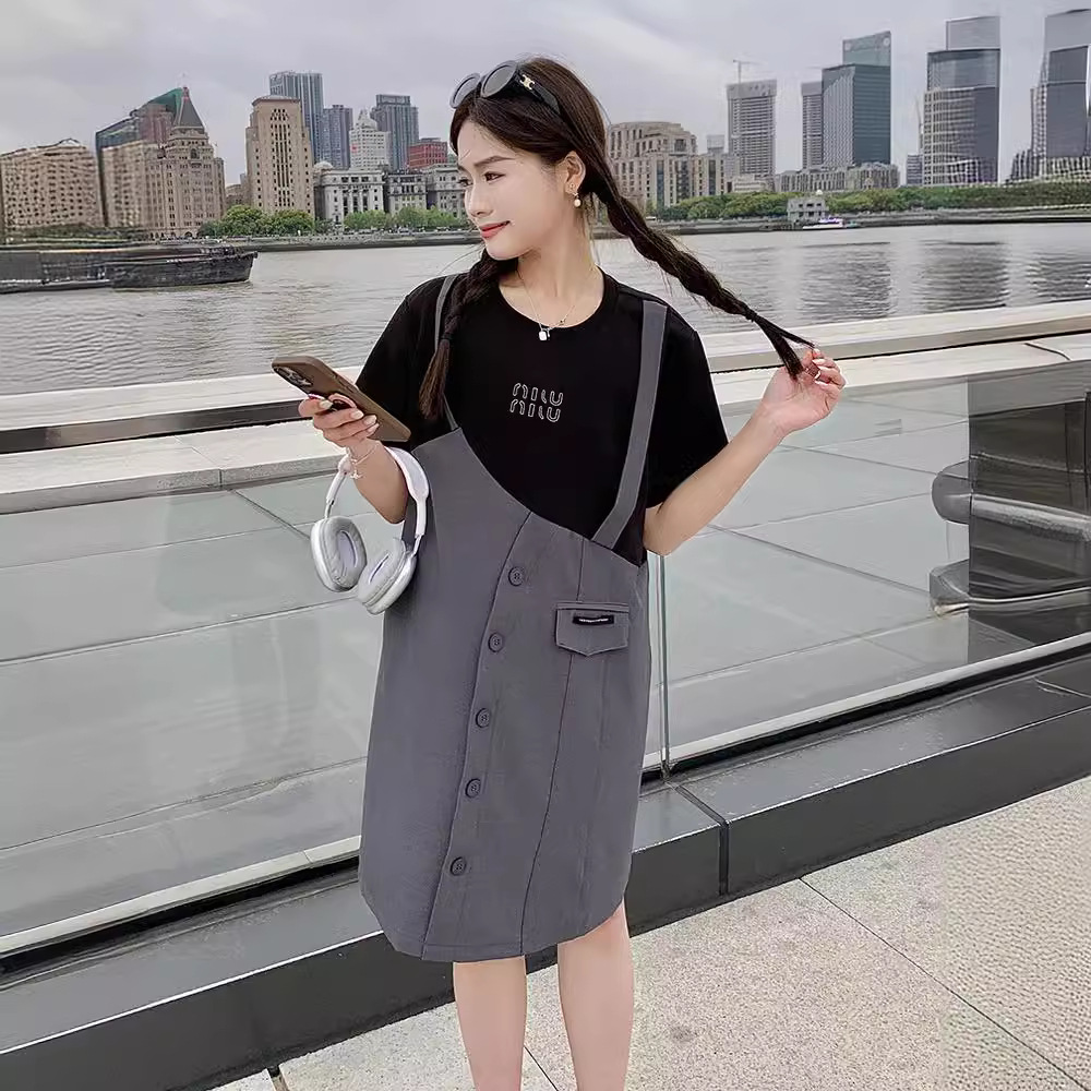 夏新款懒人洋气圆领拼接假两件连衣裙时髦少女感休闲气质中裙