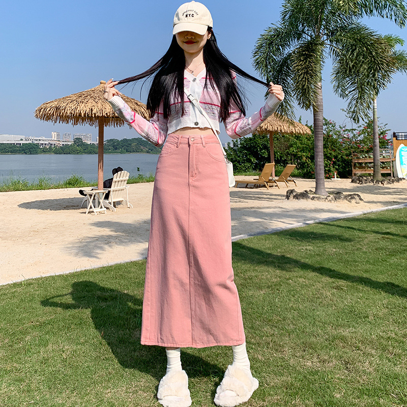高腰牛仔半身裙女春季新款粉色a字中长款显瘦包臀裙子辣妹潮
