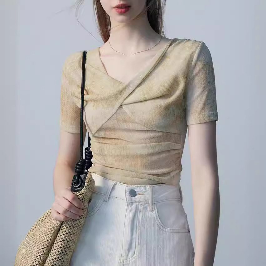 网纱扎染水墨印花扭结V领T恤春夏款法式设计感收腰显瘦上衣
