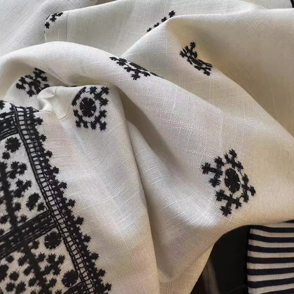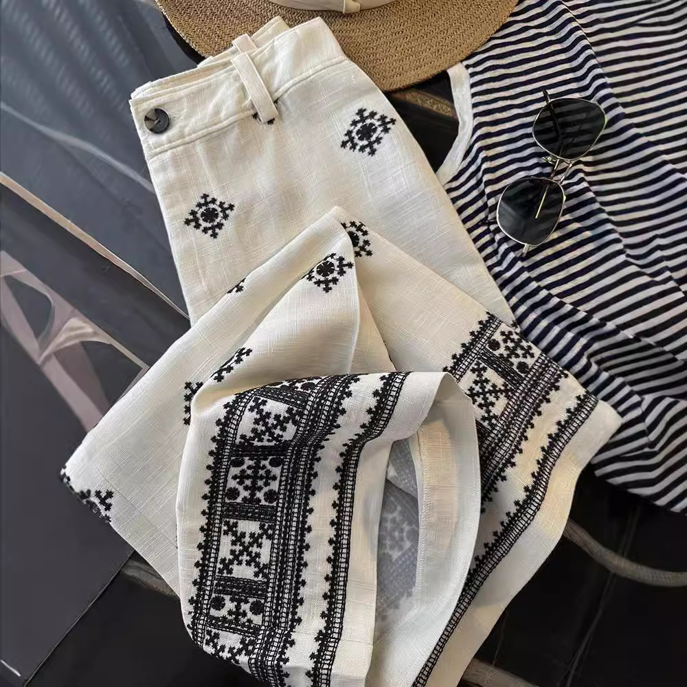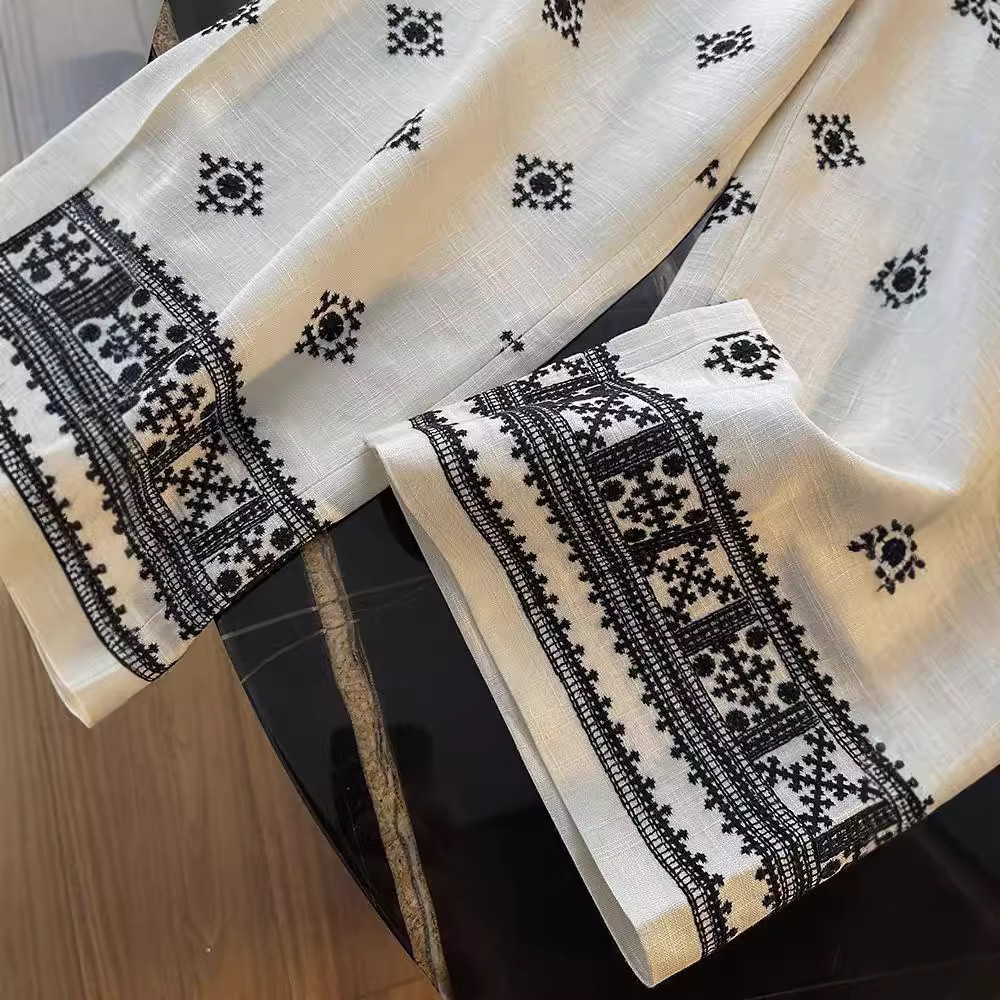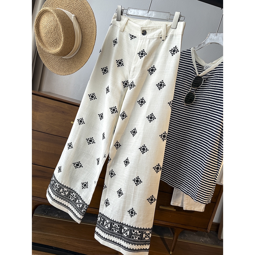 2025夏季新款时尚高腰阔腿裤女薄款显瘦复古刺绣休闲宽松直筒裤女
