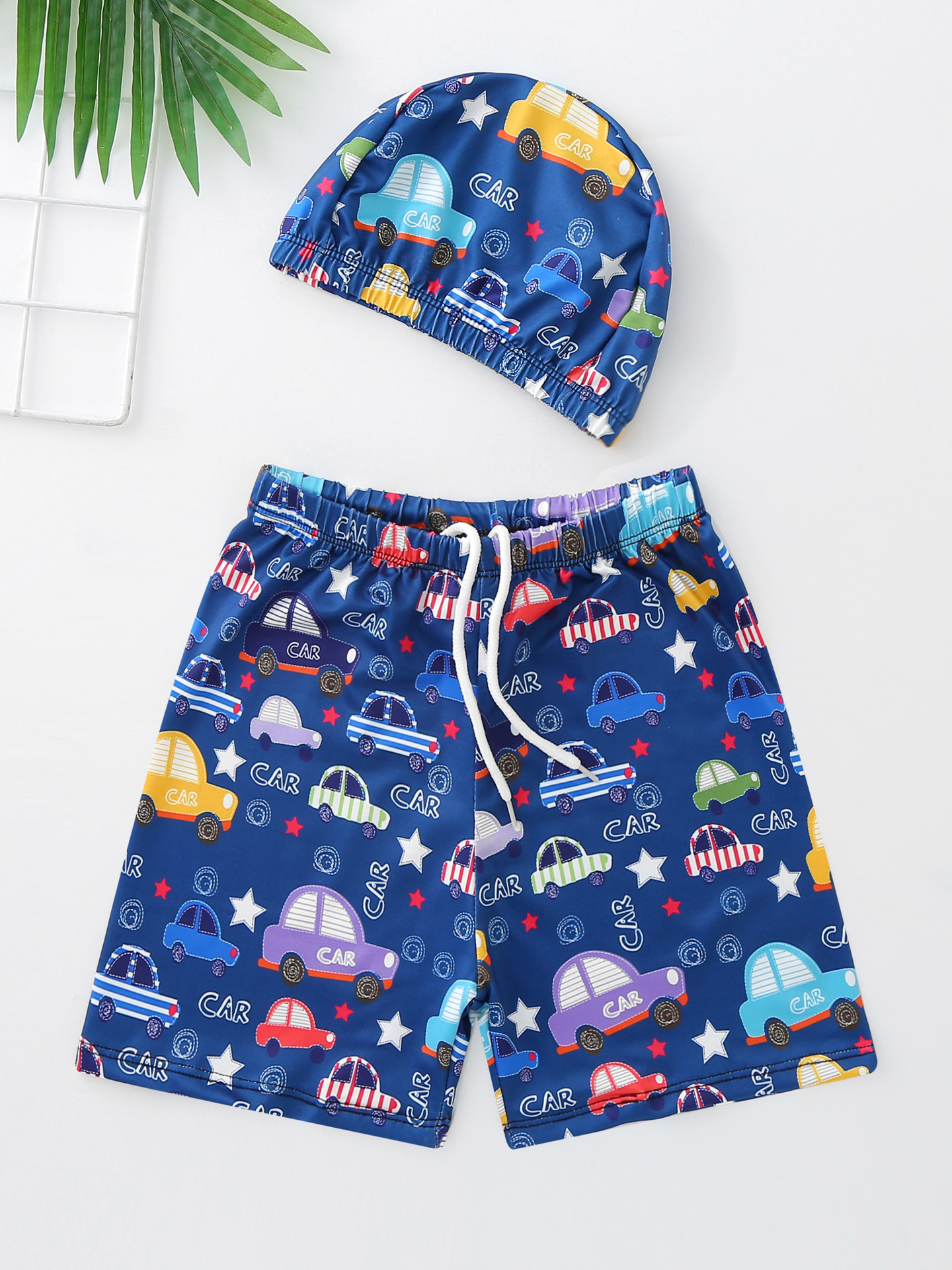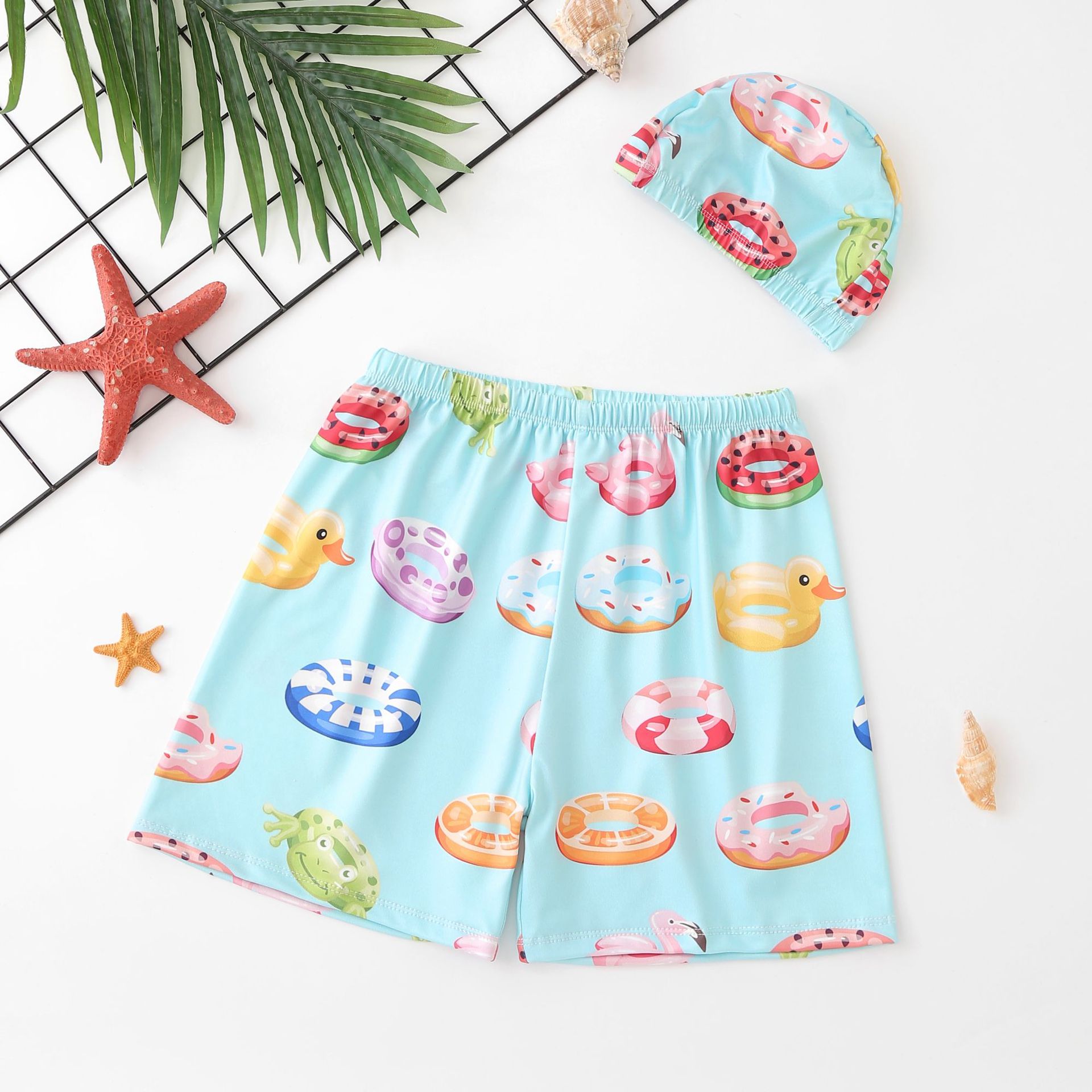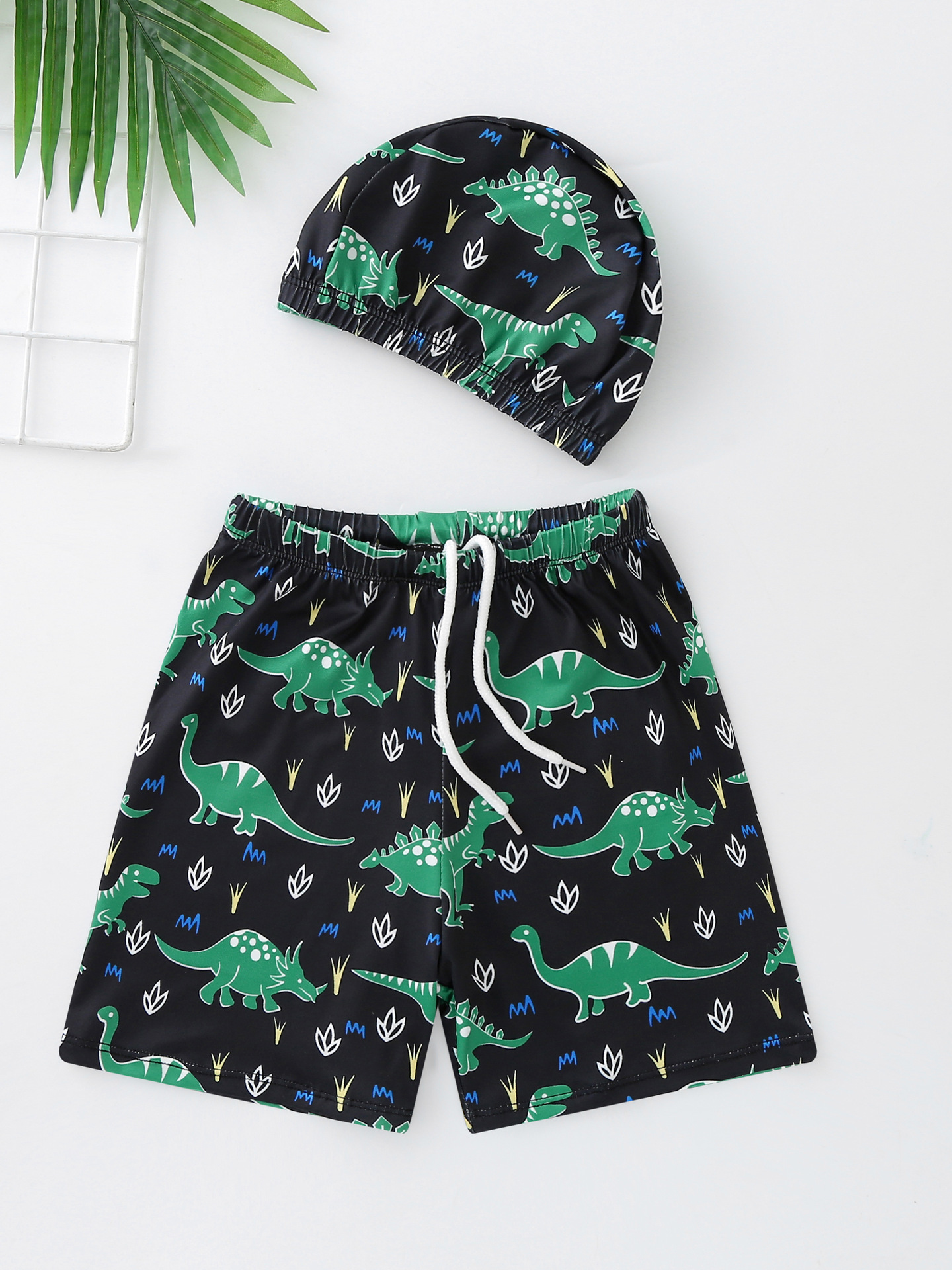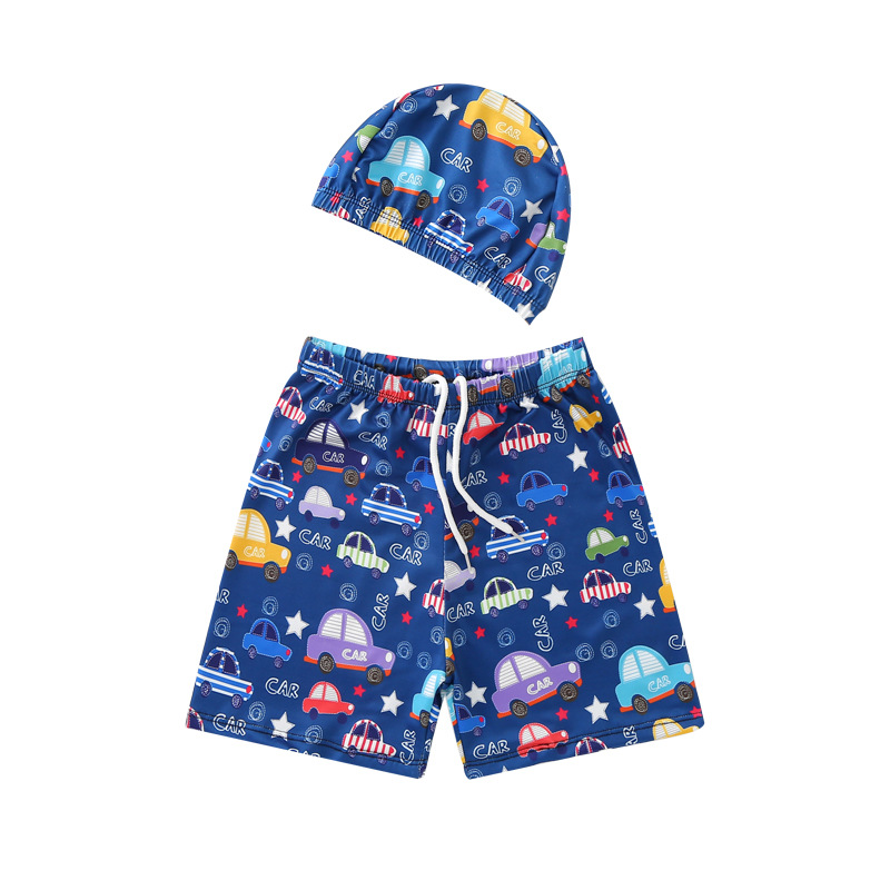 儿童泳裤宝宝卡通沙滩裤男孩平角裤泳帽游泳套装男童泳衣跨境批发