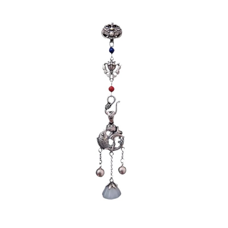 鱼戏莲民族风压襟挂件铜镀银仿和田玉旗袍斜襟流苏吊坠两用配饰女