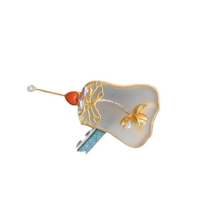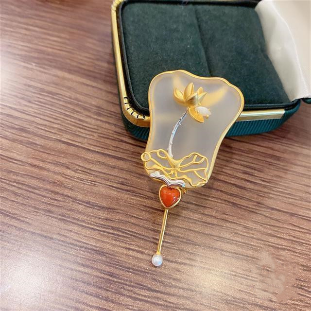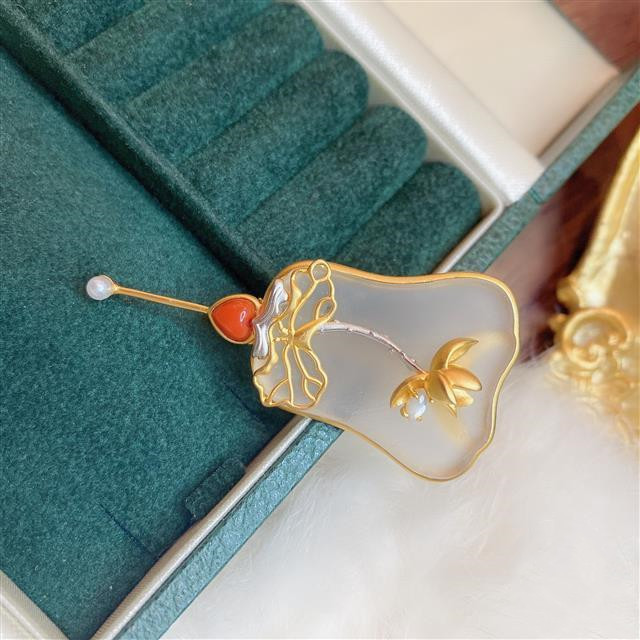 新款 新中式镀925银鎏金设计天然白水晶磨砂玉芭蕉扇胸针搭配复古