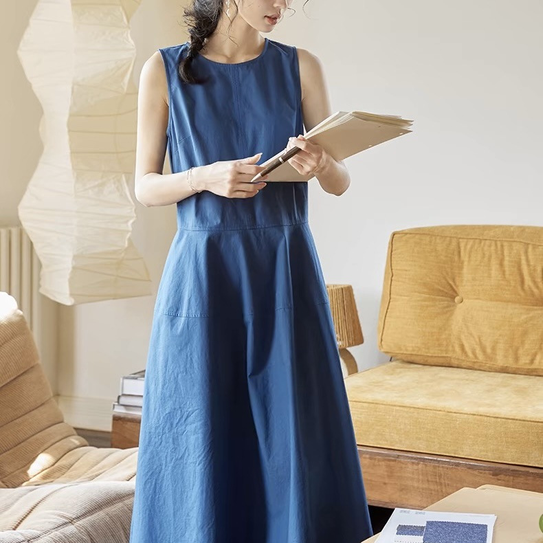 夏季蓝色优雅复古赫本风连衣裙简约圆领显瘦中长款裙子