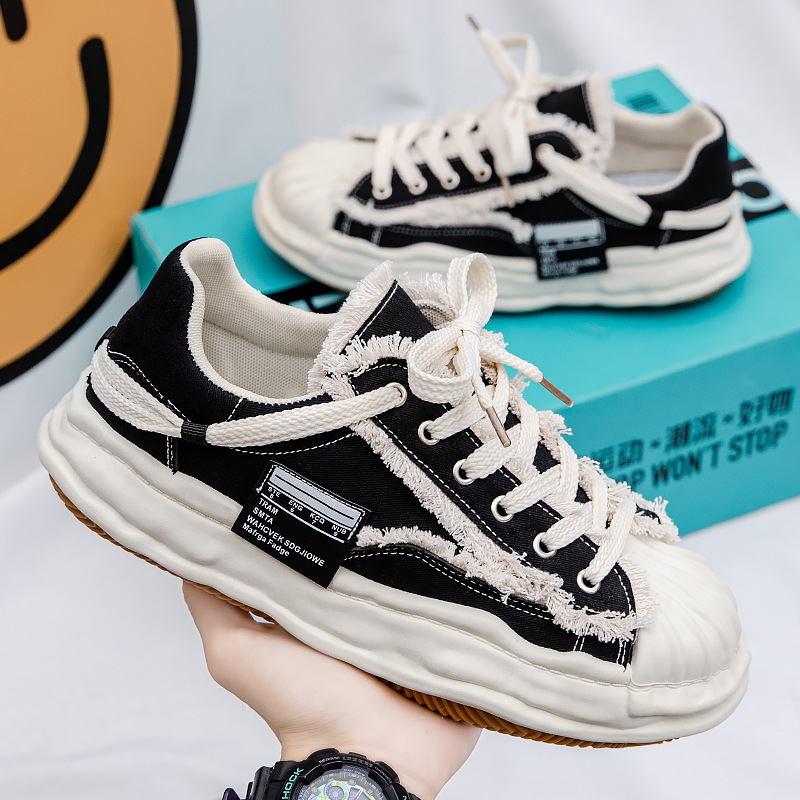 四季款小众牛仔布透气板鞋复古港风潮搭溶解厚底男鞋
