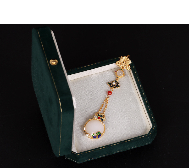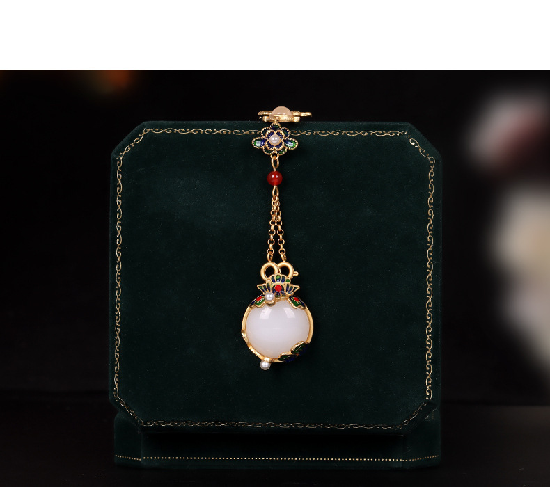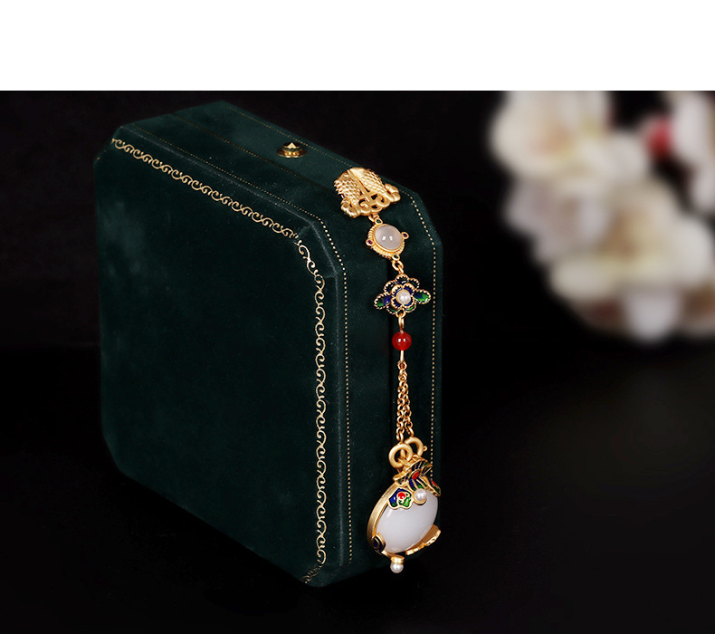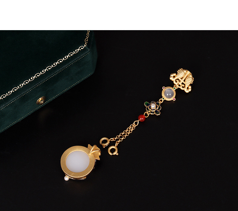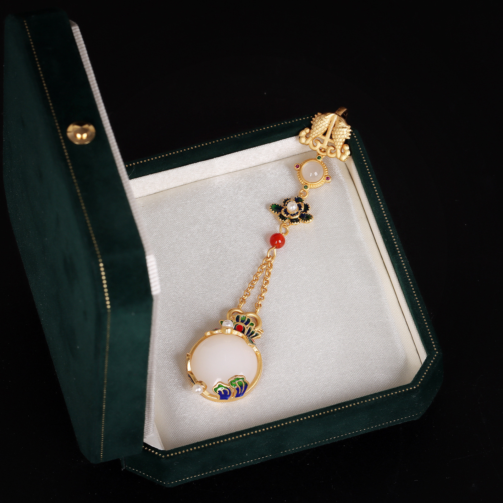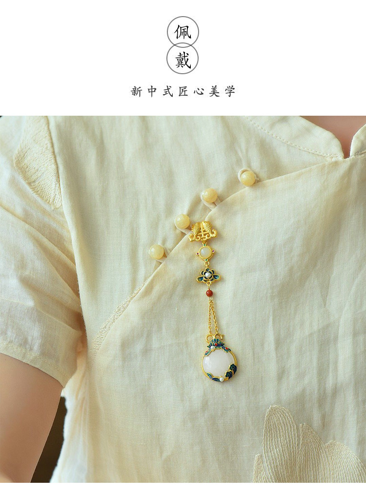 中国风复古旗袍珐琅压襟扣金色仿和田玉中式吊坠挂件两用款胸饰